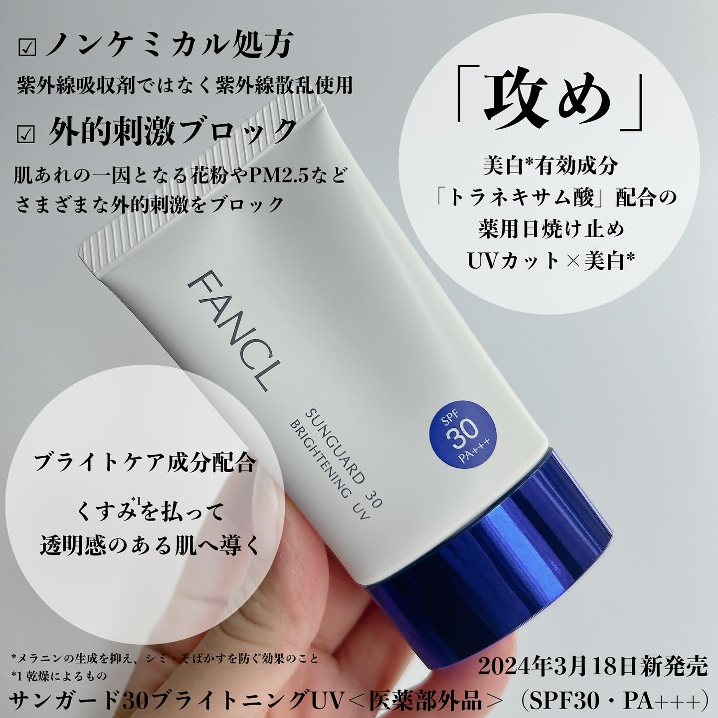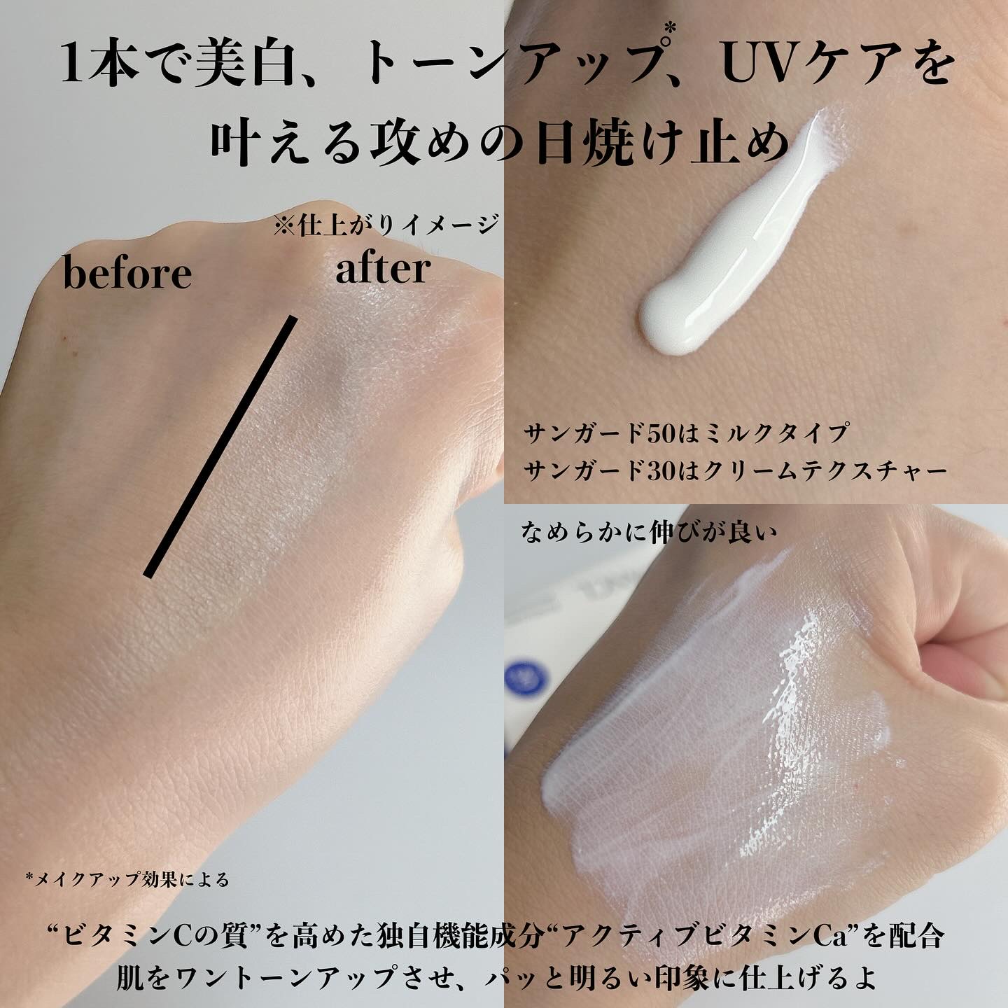 - 【医薬部外品】 ○日常の紫外線や乾燥から肌を守り、美白※効果のある日やけ止めです。 ※「美白」とは、メラニンの生成を抑え、シミ・ソバカスを防ぐ効果のことをいいます。 ○透明感の高い紫外線散乱剤をスキンケア成分でコーティングした敏感肌にもやさしいノンケミカル処方です。 ○肌をワントーンアップさせ、ぱっと明るい印象に仕上げます。