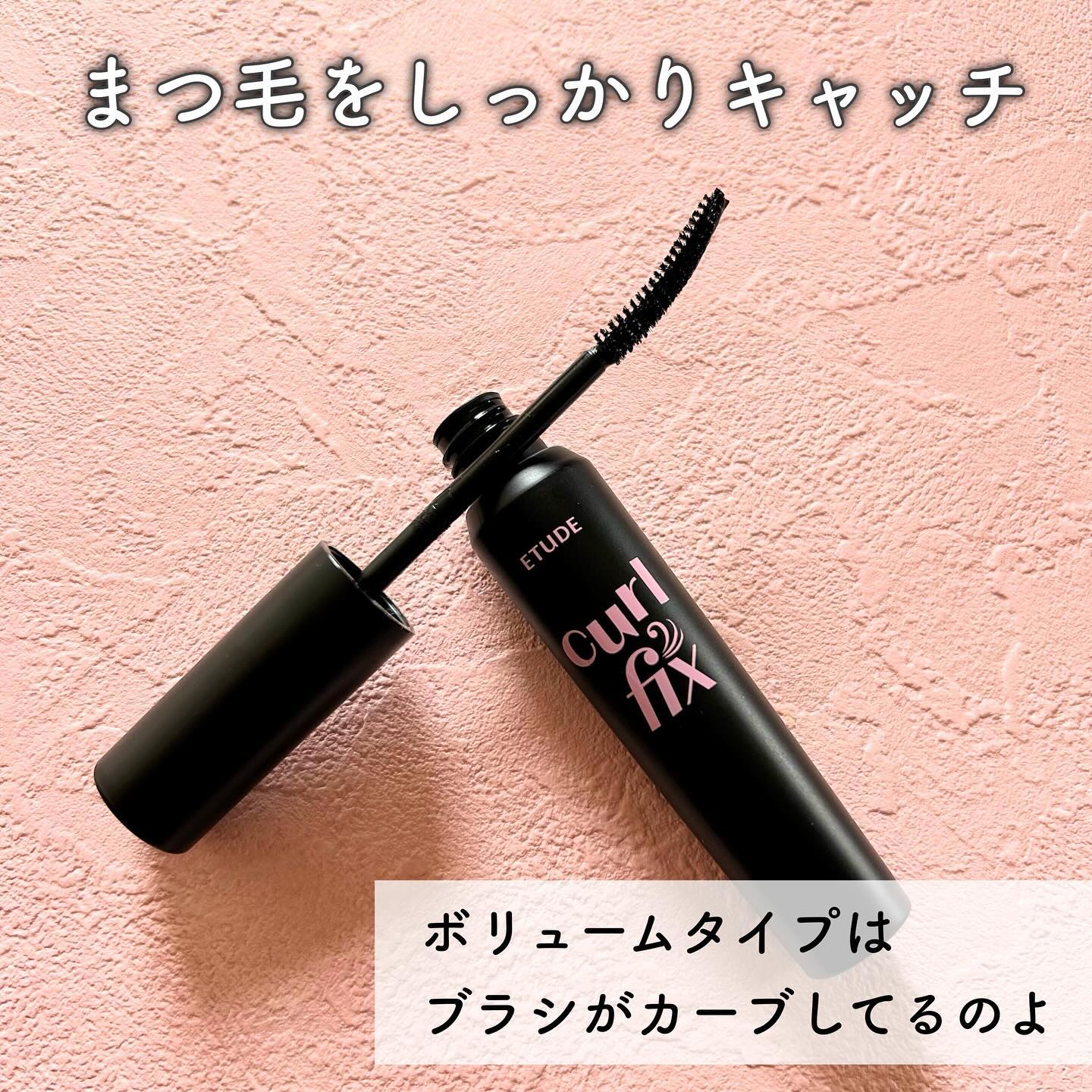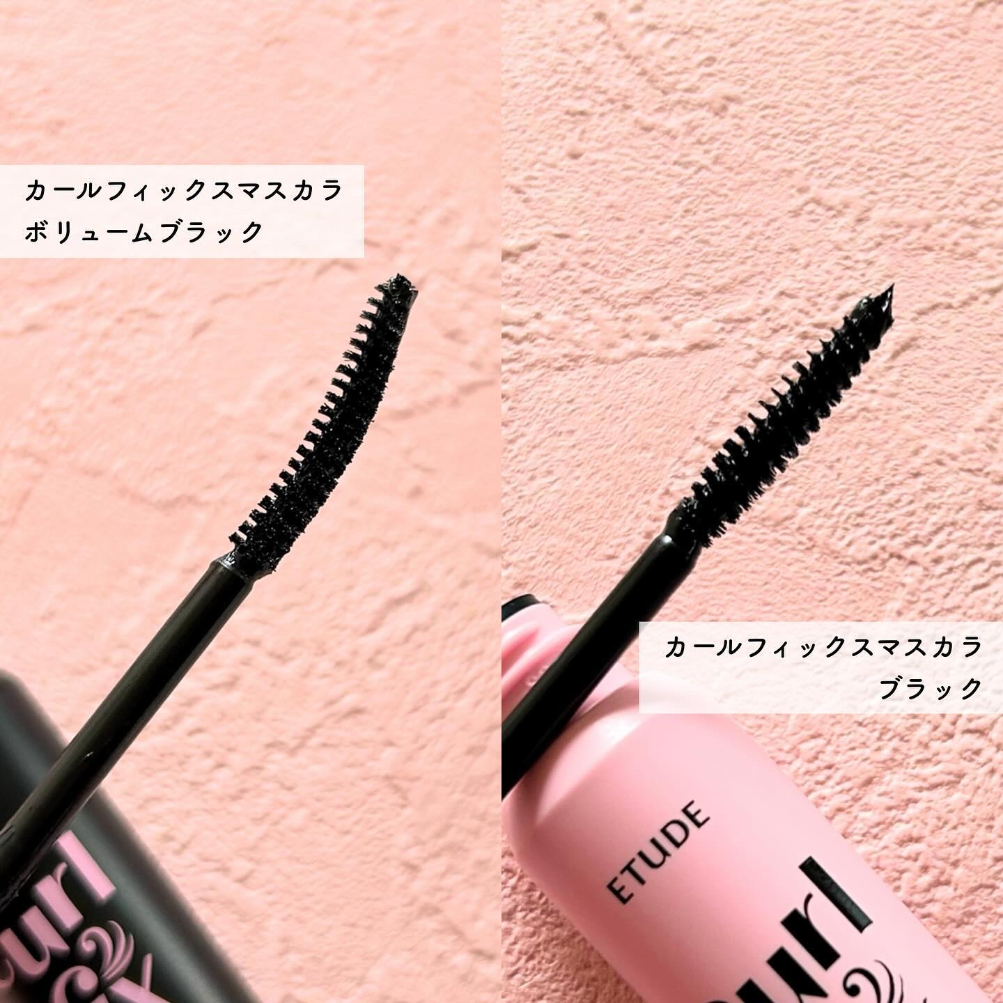 #エチュード の人気マスカラからボリュームタイプ登場🖤 既存のカールフィックスマスカラのブラシより細めで、四角にカッティングされ、目の曲線に沿ってカーブしたスクエアフィットブラシが特徴。 くっきりとしたクリアブラックで印象的なまつ毛を演出 細めのブラシなので、細かいことろにも使いやすくて、下まつ毛にも塗りやすいです。 まつ毛のカールを長時間キープしてくれる#マスカラ下地 カールキープ、ボリュームアップ、トップコートの1本3役👀