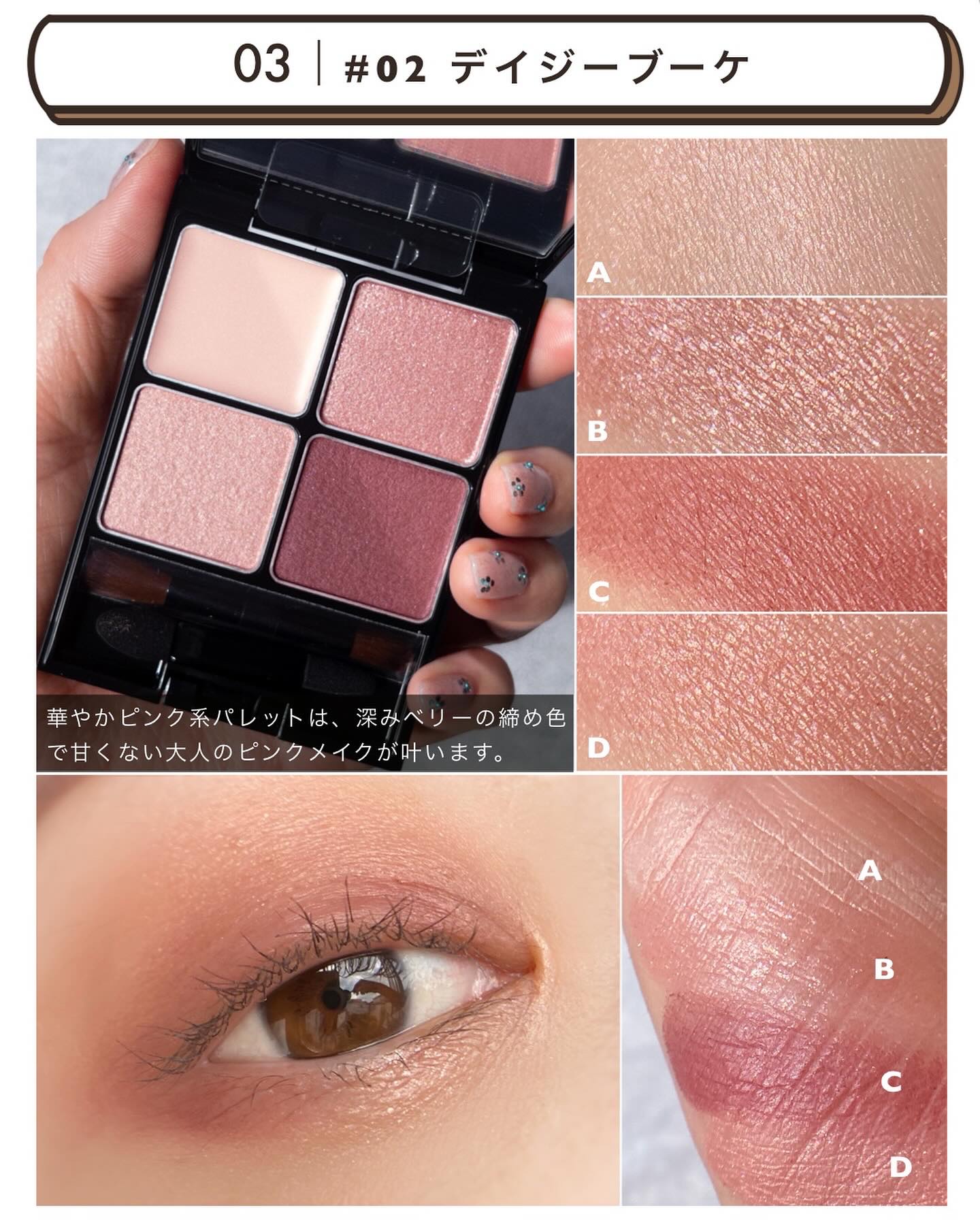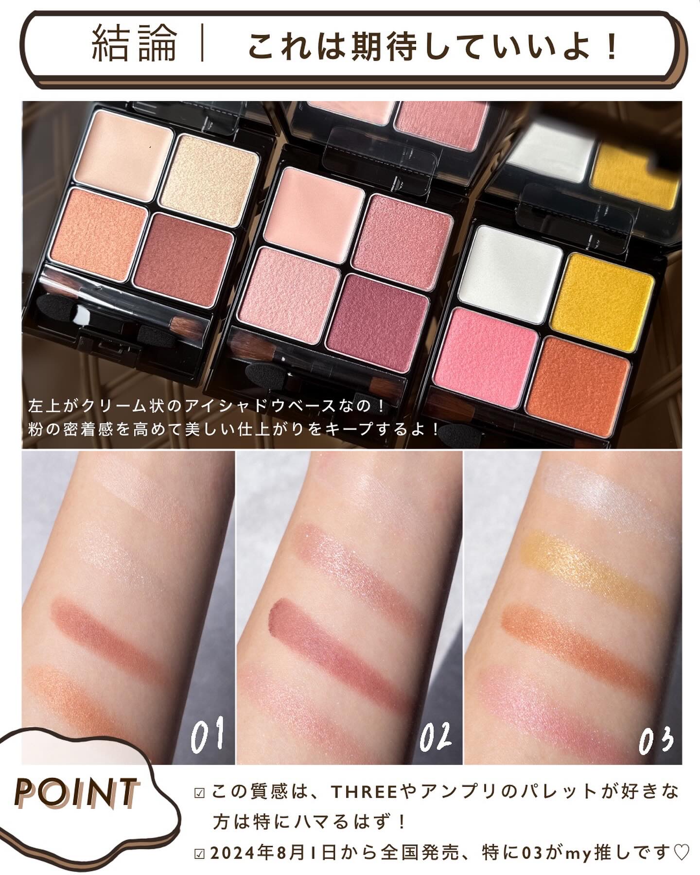 アンプリのベーシック系のカラーの中でもひときわニュートラルな、色味を削いだようなベージュブラウン。 こちらも少し前(7/30)にレビューしているのでそちらもご参考いただけたら🙇♀️ このパレットはベーシックでありながらトレンド感もあるところがお気に入りポイントでして、ちょっとセピアを帯びたようなくすみ感がなんとも言えずお洒落な雰囲気を醸し出してくれます。 というのは全体的に肌に馴染むようなヌーディカラーで構成されたすごくナチュラルなシェードなんだけど、シルバー系のパールが潜んでいたり、少しくすみ感があったりと、甘さを取り除いてクールな仕上がりになるところがめちゃくちゃかっこいいのよ。 ダイヤモンドを彷彿とさせるような大粒のラメの煌めきがたまらなく美しいアイカラーです。 このパレットの好きなところは、マットが主役なところ。絶妙にニュアンスの異なる3色のマットでグラデーションしやすいのがミソです。 パールカラーの入れ方次第で表情が変わるパレットだと思う。