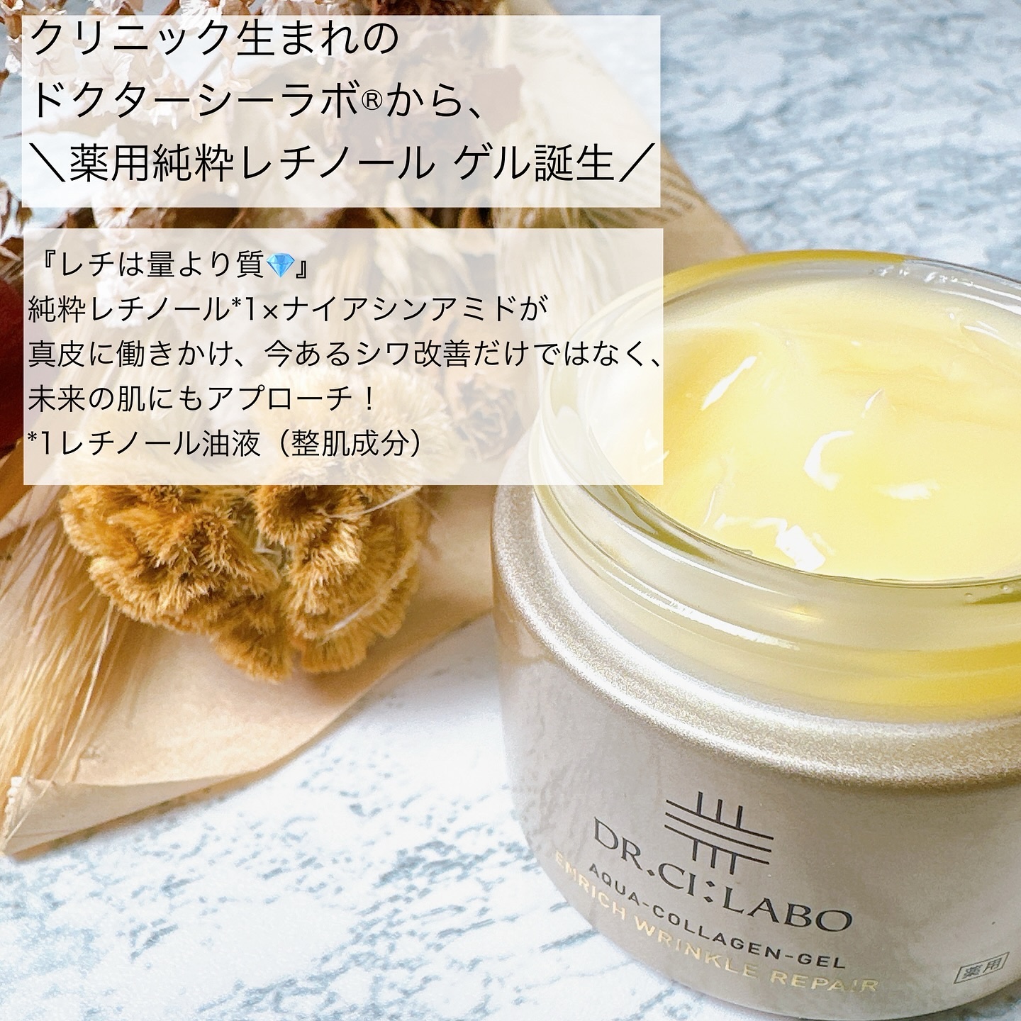 ドクターシーラボ®️の純粋レチノール*inゲルなら、みずみずしいテクスチャーで使いやすく、レチノール*と有効成分ナイアシンアミドを取り入れられます✨ 25年の研究を経て作られた本気のエイジングケア**アイテムだそうで、気になるシワ改善や乾燥による毛穴の目立ちのケアができちゃいます! 使い心地がとにかくみずみずしく、ベタつきにくくスーッと馴染むところが個人的にはお気に入り。