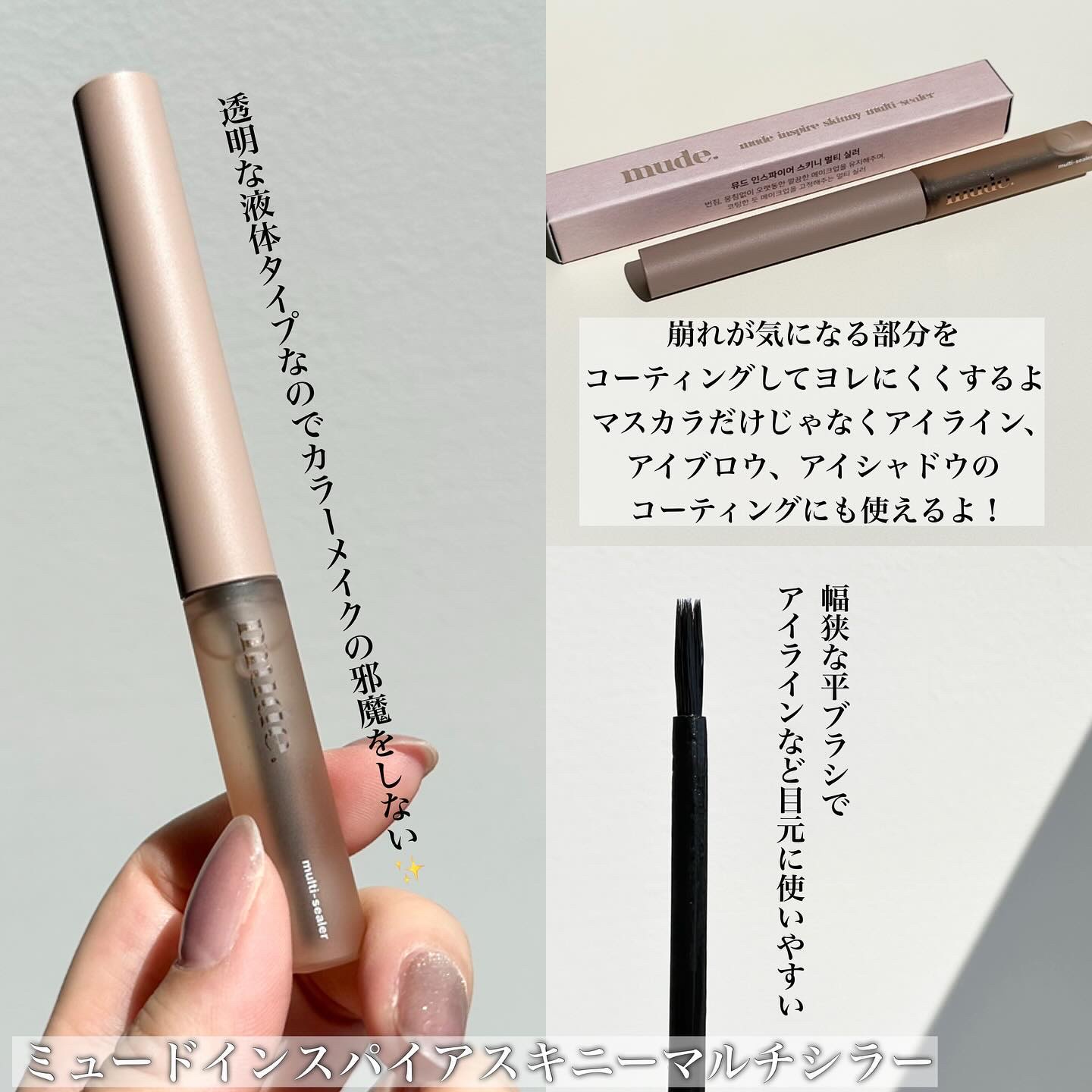 手に試した感じではベースのブルーは弱く、ラメ自体がブルーで可愛すぎる…! BAさんはパウダーアイシャドウのベースにもおすすめと教えてくれたので、 今日はこちらをベースにピンクブラウン系の アイシャドウを使ってメイクしてみたよ🫶🏻 肌に伸ばすとすぐにサラサラになるから ベタベタが残ったりしないし、 パウダーアイシャドウの上に重ねてもヨレない◎