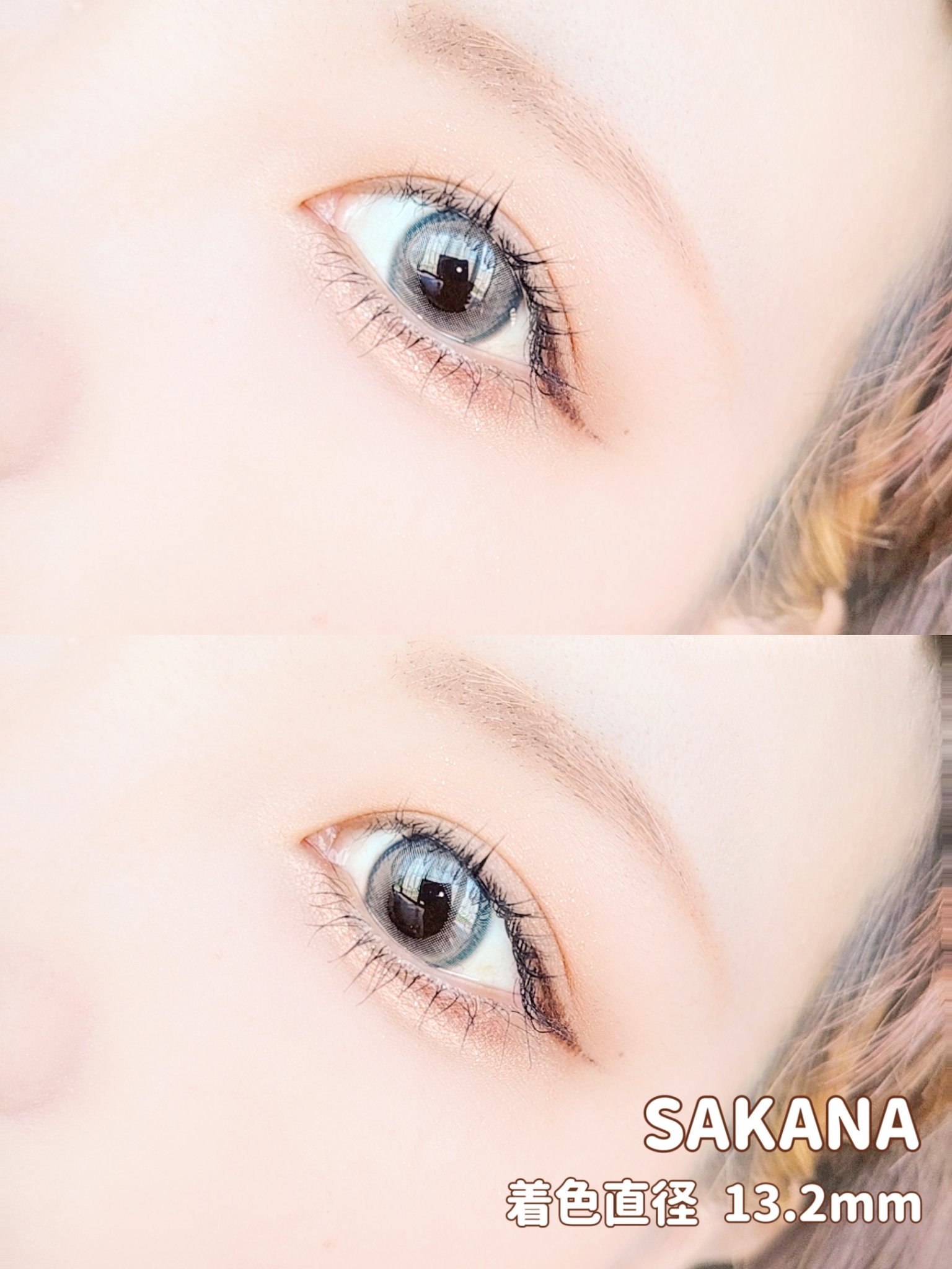 鮮やかなライトブルーとブラックのコントラストが煌めいて高発色な水光グラデーションと海の波のようなデザイン性が唯一無二の瞳に。 高発色なのにマイルドなカラーでつけやすい! ブルーベリーのようなぷるぷる感と細フチが愛らしいモーヴグレーレンズ♡