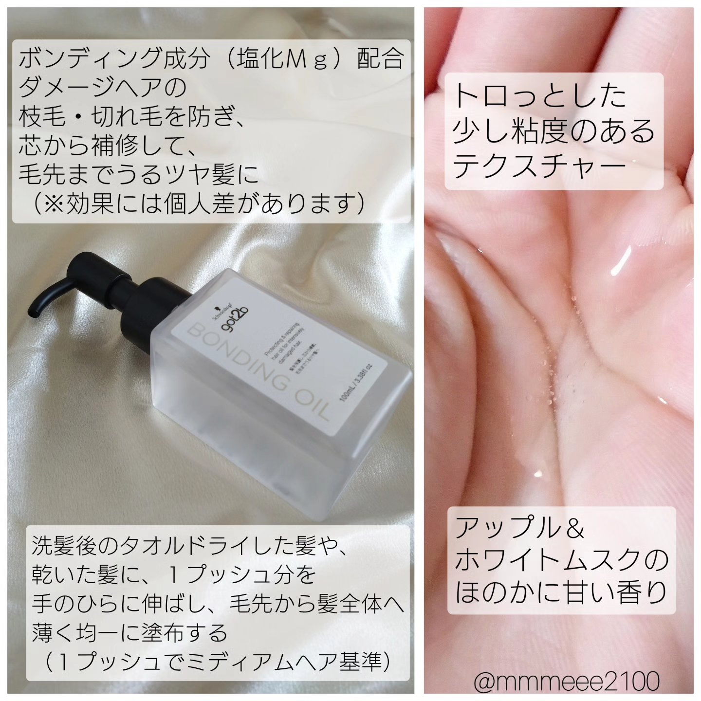 - サロン級の集中補修!ハイダメージ髪用ヘアオイル ブリーチやカラーを繰り返したハイダメージ髪向けに開発 〇サロン発のボンディング・テクノロジーを搭載。芯から補修・髪を保護し、毛先までうるとぅる髪へ 〇3種類のボタニカルオイル(植物由来のアルガンオイル*¹、ピーチシードオイル*²、アピニシアンオイル*³)配合。パサつきの気になるダメージ髪に保湿と上質なツヤを与えます 〇パラベンフリー&無着色 〇アップル&ホワイトムスクの香り *¹アルガニアスピノサ核油 (保湿) *²モモ核油(保湿) *³クランベアビシニカ種子油(保湿)