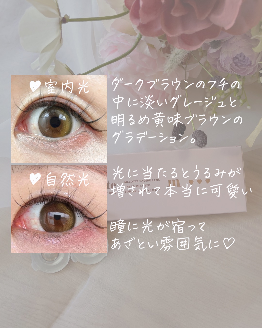 【melotte(メロット)新色オンリーマイン】アカリンプロデュースの新作を試しました✨✔︎ワンデー✔︎DIA14.2mm/着色直径13.0mm✔︎UVカット・うるおい成分入り発色はふんわりライトなブラウンで、ほんのり白っぽさがあって透明感あ...