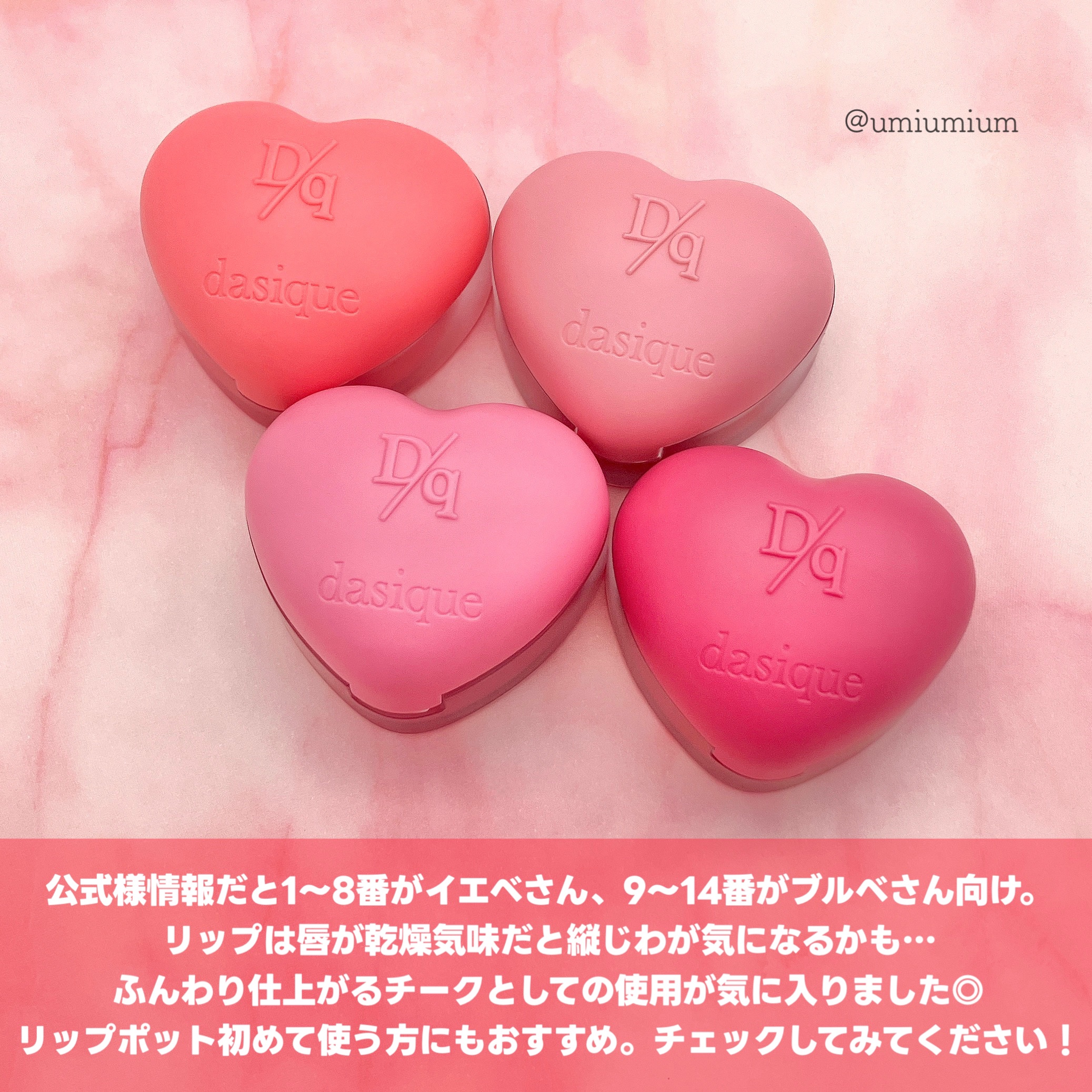 かわいいが溢れるdasiqueスウィートハートコレクションからハート型のリップポットが登場🩷 ポットタイプのリップ&チークは蓋を回すものが多いけどこれはパカっと開くのが使いやすい👏 1個2,000円は一見高く感じますが、内容量6.5gと他ブランドと比べて1.5gほど容量が多く、ミニブラシも内蔵されているのでコスパはそこまで悪く無いかも🤔