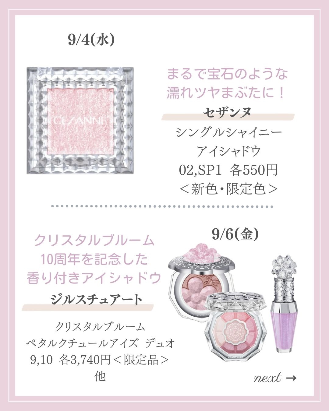 エクセル2022年11月15日(火)発売 デイジードール2022年11月18日(金)発売 マジョリカマジョルカ2022年11月21日(月)発売 リリミュウ2022年11月21日(月)発売 キャンメイク2022年11月30日(水)発売 ヴィセ&ヴィセリシェ2022年12月1日(木)発売 セザンヌ2022年12月上旬発売 リップモンスター2022年11月&12月発売11月19日(土)発売👉ミニサイズ(既存2色)12月17(土)発売👉限定2色