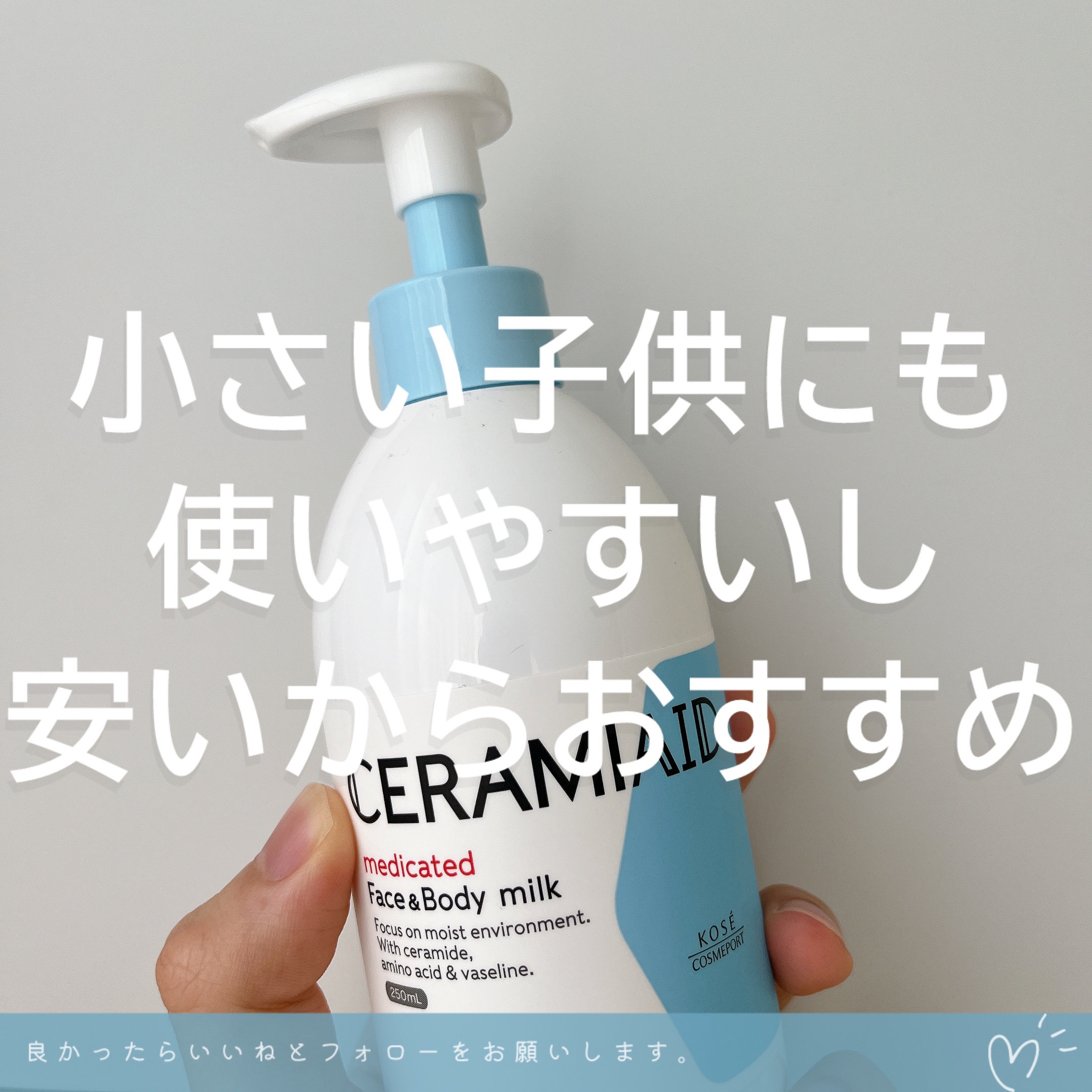 赤ちゃんにも使えるボディミルク ・人が作り出すセラミドと同じ構造をした『ヒト型セラミド』が肌のバリア機能を補ってくれる 軽いつけ心地なのにしっかりうるおう ・浴室で保湿できるから子供のお着替えが早く終わる ポンプタイプが使いやすい ・ドラッグストアで買える(※一部店舗を除く)