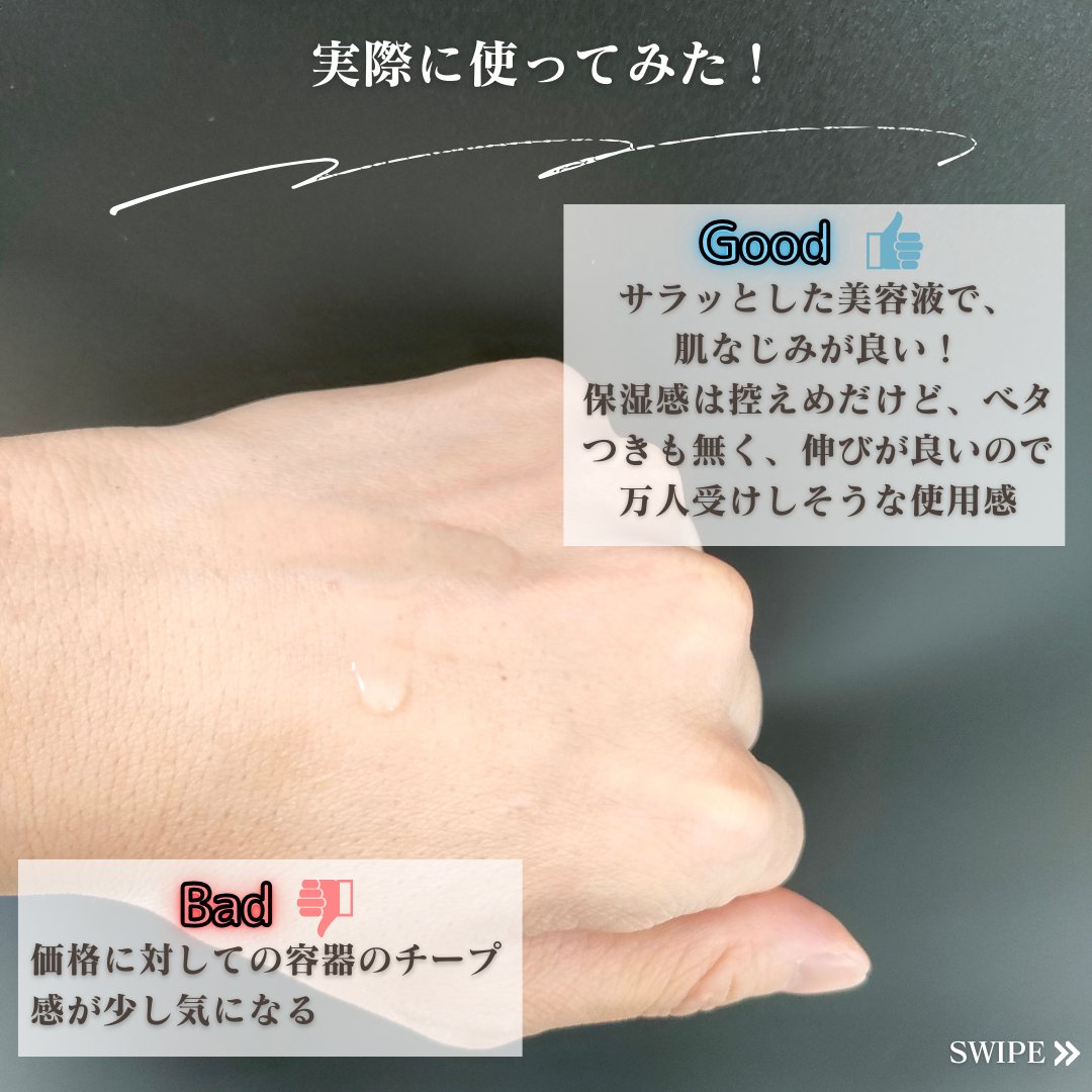 化粧水前に塗布しても、特に効果を感じれなかった。 個人的には塗布有りと無しで差を感じれなかったので、リピは無しかなーという感じです! 化粧水の浸透を高める目的ではなく、導入化粧液→美容液→乳液・クリームという使い方であれば、まだ効果を感じやすいかも? ジャバシャバかつ成分的にも化粧水を重ねて使う必要はなさそう! 使ったことがない人はトライしても見ても良いかも? 口コミでは効果を感じたとの声も多かったので!