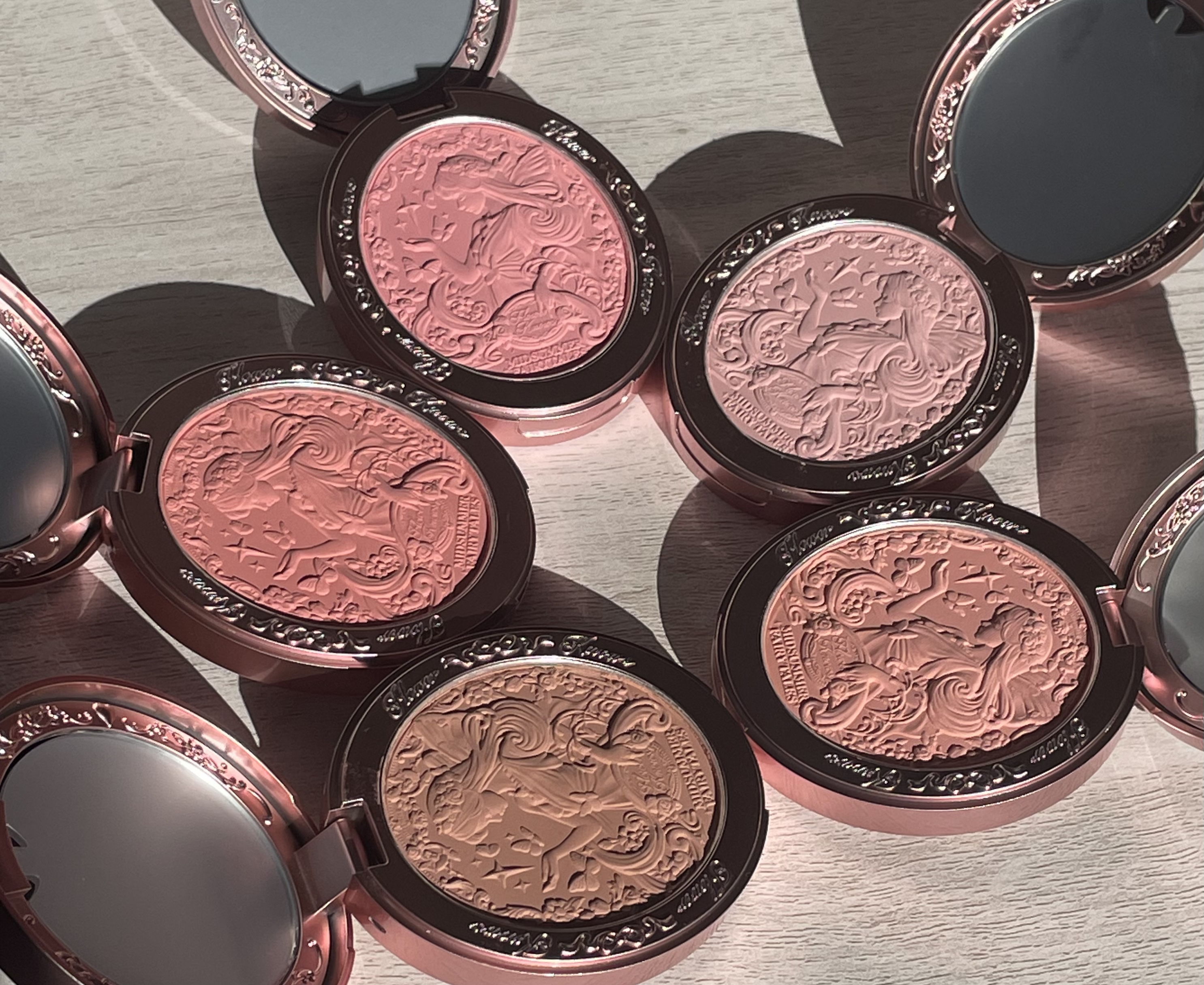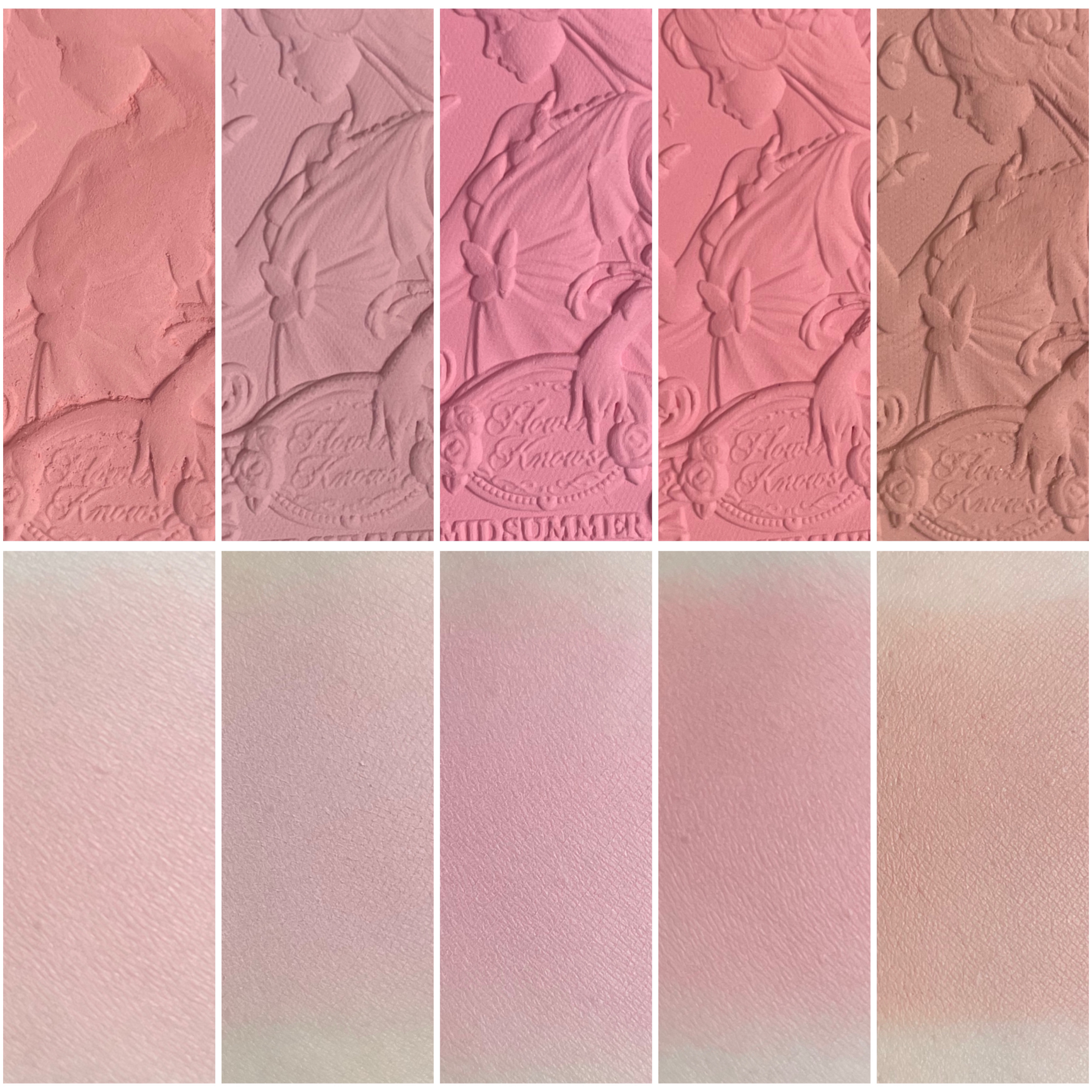 大優勝なFlower Knows新作🧚♀️💫 MID SUMMER FAIRY TALES COLLECTION チーク全色スウォッチ💭🎀🌷🌙 私のお気に入りは♯05Valley Lilyです🙌🏻 ̖́- ヌーディーカラーだけど血色よく見える可愛いカラーでした♡ 今回もパケ大優勝で色味も可愛い色みばかりなので気になった方ぜひチェックしてみてくださいね🧚♂️💕︎