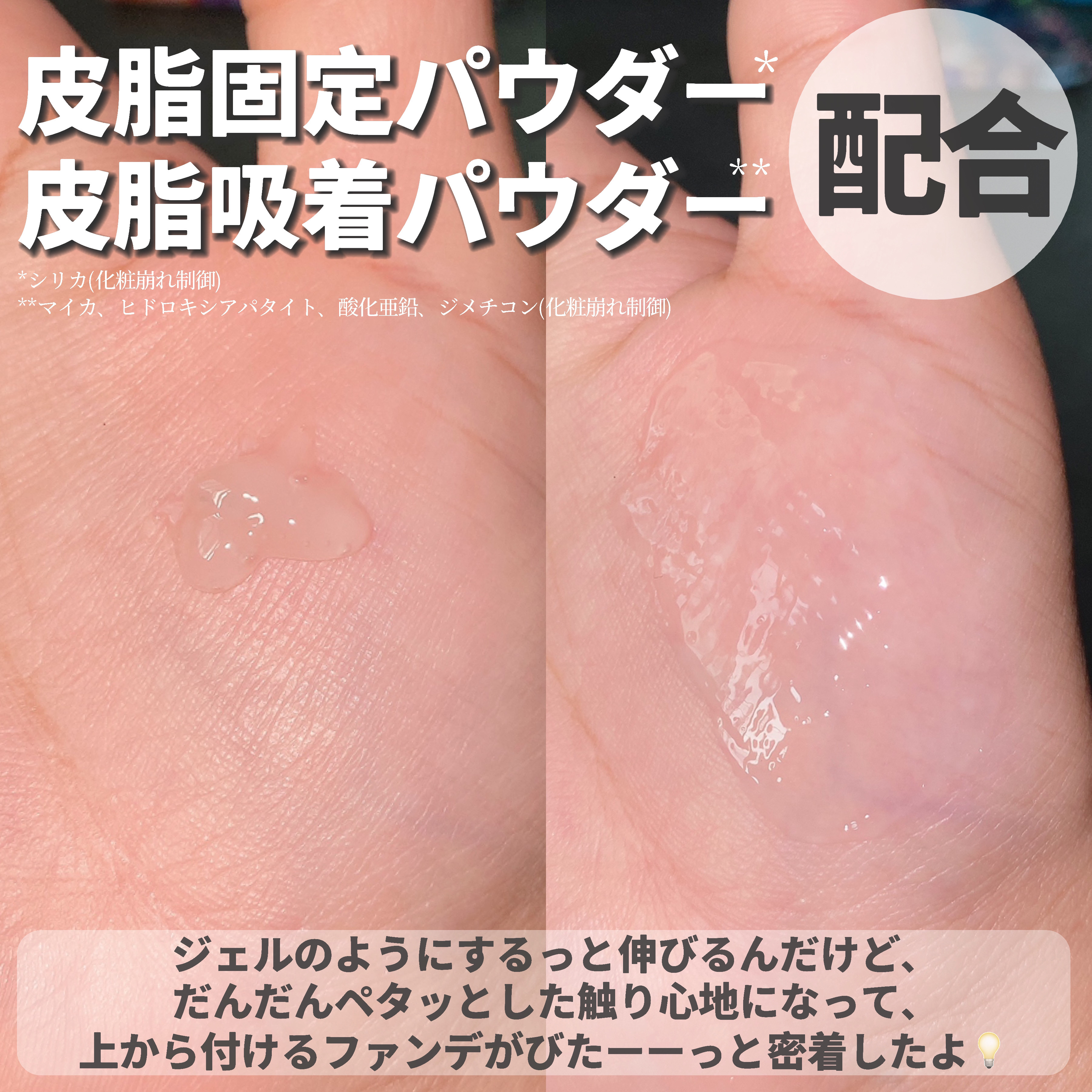 - 肌にうるおいを与えながら1日中メイクをしっかりキープ! ●うるおい密着ヴェール 肌にうるおいを与えながら密着し、化粧持ちがアップ。保湿しながら使用できるため、メイク時の乾燥が気になる人にもおすすめ。 ●Wパウダーで化粧崩れ防止 皮脂吸着パウダー※1と皮脂固化パウダー※2が汗・皮脂をブロック。 ●肌引き締め成分in アーチチョーク葉エキス(保湿成分)を配合。 ※1シリカ(化粧崩れ抑制) ※2マイカ、ヒドロキシアパタイト、酸化亜鉛、ジメチコン(化粧崩れ抑制)