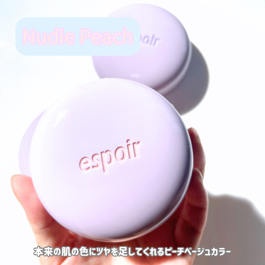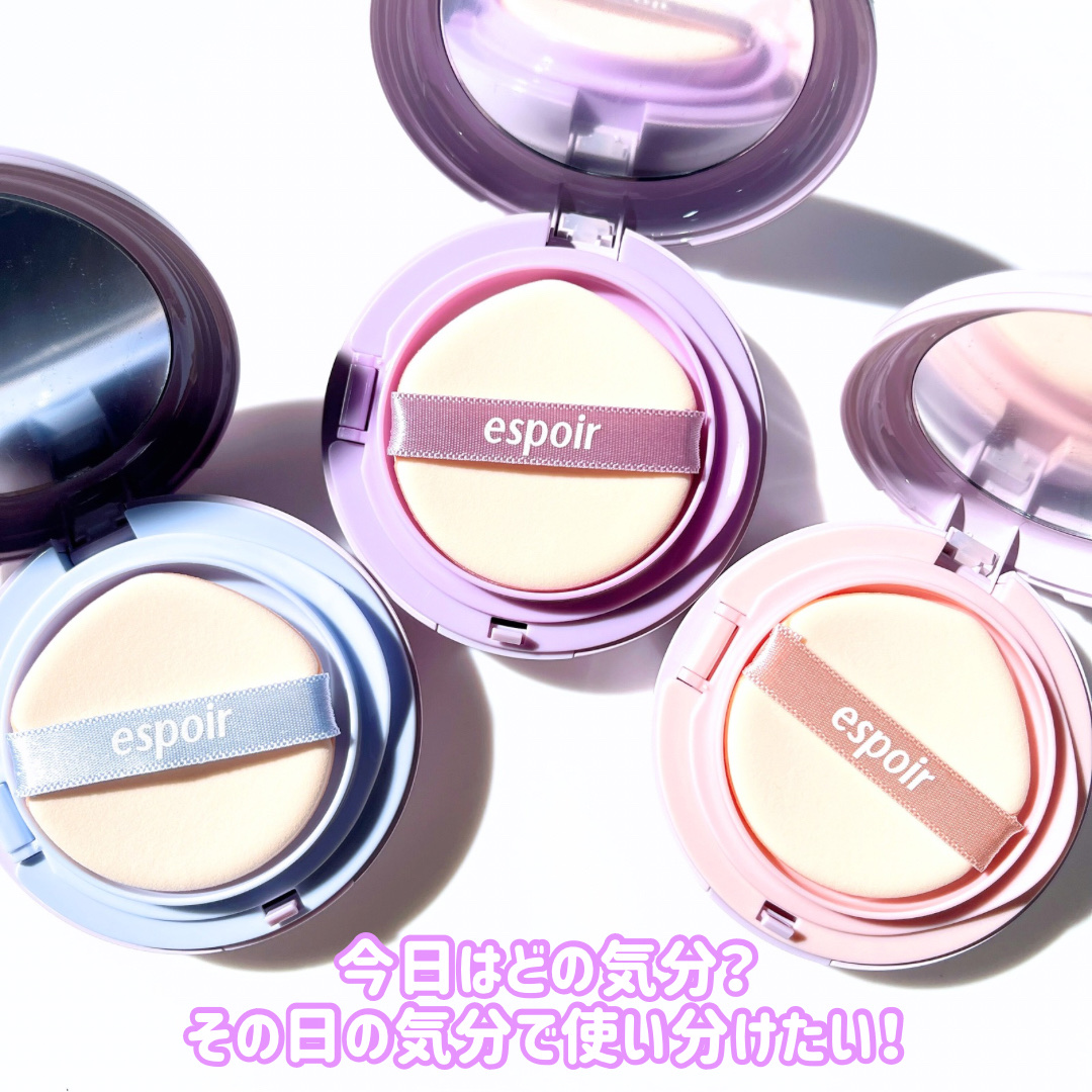 ゼリーのようにぷるんと水光肌へ🩵 今回はespoirのトーンアップクッション!ファンデの前に塗ることで肌のトーンアップをし透明感のあるみずみずしい肌へと✨️ 私が今回使用したのは【スノーブルー】🩵 反射板を当てたようにくすんだ肌をトーンアップして透明感のある肌へ 高保湿ヒアルロン酸とセラミド配合で乾燥せずしっとり一日中快適な肌へ