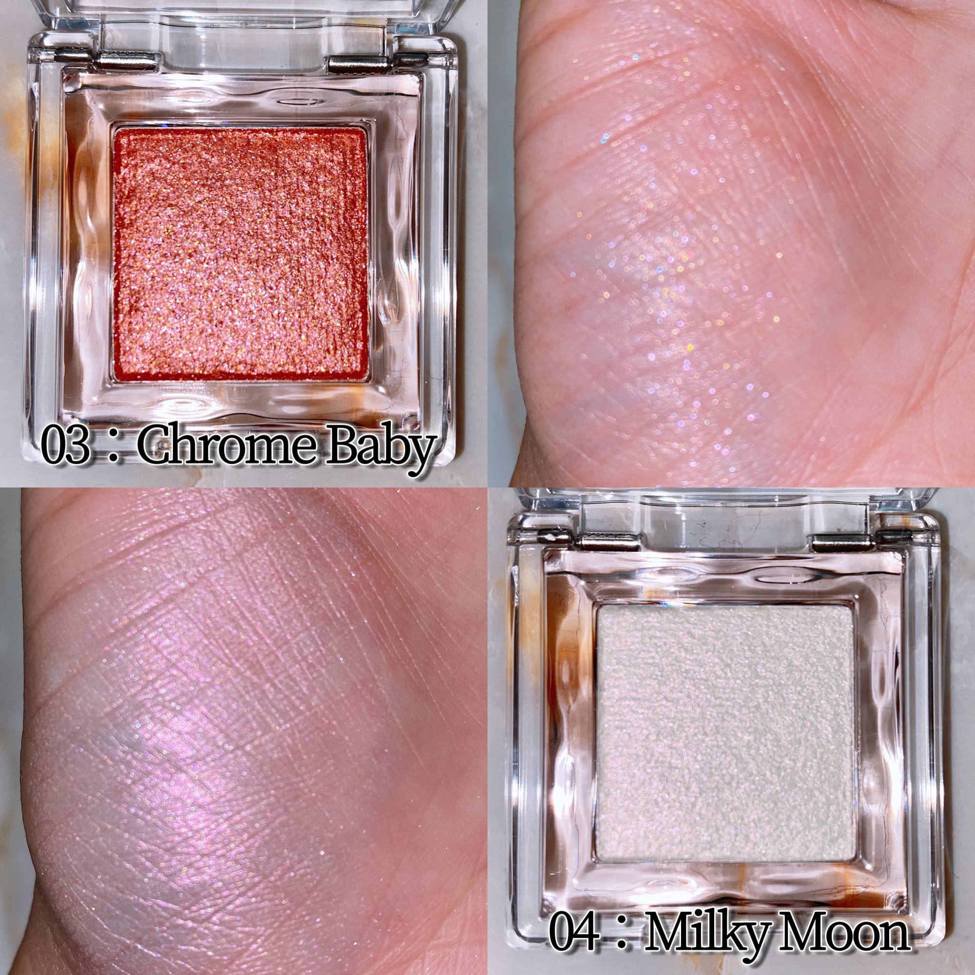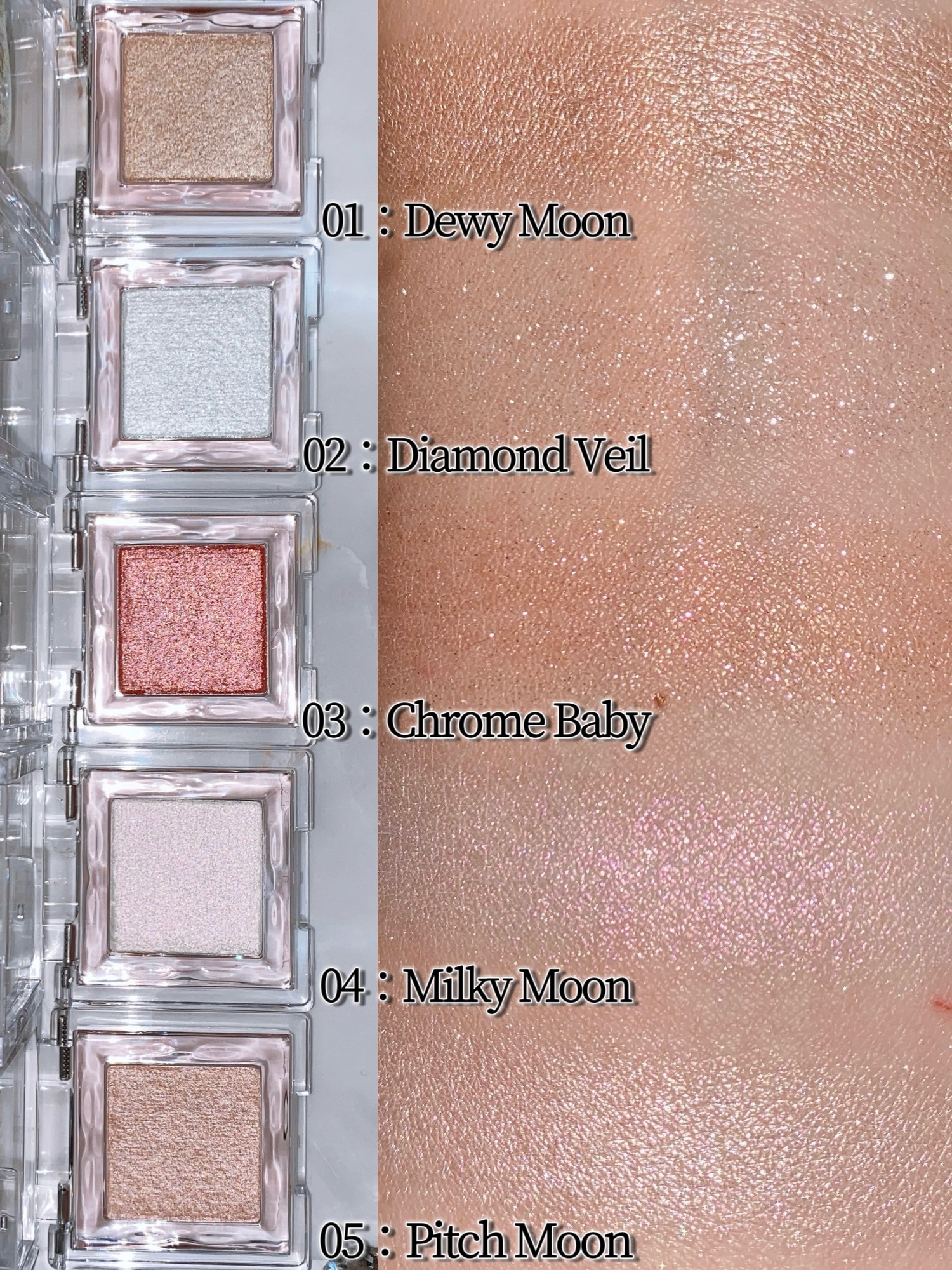- <Dewy Moon> 合成フルオロフロゴパイト、酸化チタン、マイカ、(HDI/トリメチロールヘキシルラクトン) クロスポリマー、シリカ、リン酸Ca、ジメチコン、酸化鉄、グリセリン、トリエトキシカプリリルシラン、パルミチン酸イソプロピル、ケイ酸(AL/Mg)、ペンチレングリコール、ミリスチン酸Mg、ポリソルベート20、ステアロイルオキシステアリン酸オクチルドデシル、(アクリルアミド/アクリロイルジメチルタウリンNa/アクリル酸)コポリマー、デヒドロ酢酸Na、オリーブ油脂肪酸ソルビタン、ステアリン酸ソルビタン、イソヘキサデカン、フェノキシエタノール、ソルビン酸K、エチルヘキシルグリセリン、ポリソルベート80、オレイン酸ソルビタン、トコフェロール <Chrome Baby> マイカ、ホウケイ酸(Ca/Al)、シリカ、酸化チタン、オクチルドデカノール、ジメチコン、(ジフェニルジメチコン/ビニルジフェニルジメチコン/シルセスキオキサン) クロスポリマー、酸化鉄、グリセリン、ミリスチン酸Mg、(HDI/トリメチロールヘキシルラクトン)クロスポリマパルミチン酸イソプロピル、グンジョウ、ペンチレングリコール、ケイ酸(AL/Mg)、ポリソルベート20、赤226、ステアロイルオキシステアリン酸オクチルドデシル、酸化スズ、(アクリルアミド/アクリロイルジメチルタウリンNa/アクリル酸)コポリマー、トリエトキシカプリリルシラン、オリーブ油脂肪酸ソルビタン、ステアリン酸ソルビタン、イソヘキサデカン、フェノキシエタノエール、デヒドロ酢酸Na、ソルビン酸K、エチルヘキシルグリセリン、カオリン、ポリソルベート80オレイン酸ソルビタン、トコフェロール <Milky Moon> マイカ、酸化チタン、(HDI/トリメチロールヘキシルラクトン) クロスポリマー、ジメチコン、合成フルオロフロゴパイト、シリカ、エチルヘキサン酸セチル、グリセリン、パルミチン酸イソプロピル、ペンチレングリコール、ケイ酸(AL/Mg)、トリエトキシカプリリルシラン、ポリメチルシルセスキオキサン、ミリスチン酸Mg、ポリソルベート20、ステアロイルオキシステアリン酸オクチルドデシル、(アクリルアミド/アクリロイルジメチルタウリンNa/アクリル酸)コポリマー、オリーブ油脂肪酸ソルビタン、ステアリン酸ソルビタン、デヒドロ酢酸Na、イソヘキサデカン、フェノキシエタノール、ソルビン酸K、エチルヘキシルグリセ リン、酸化スズ、ポリソルベート80、オレイン酸ソルビタン、トコフェロール
