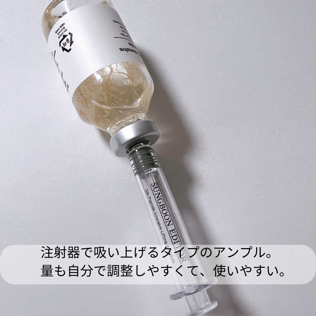 sungbooneditor(成分エディター)シルクペプチドインテンシブリフティングアンプル金色のコラーゲン糸*が特徴的な美容液✨ 注射器タイプで使う分だけバイアルから出して使います!独自の「シルクペプチド成分*」が含まれて...