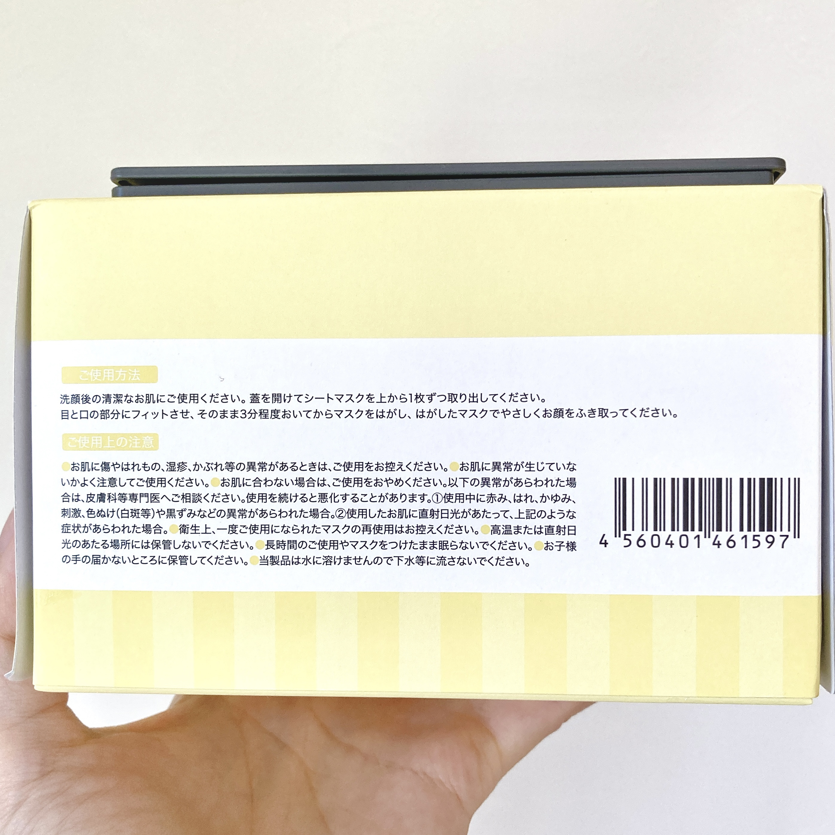 4種類の高濃度ビタミンC配合 ・レチノール配合 ・ひたひたのシート ・美容液がたっぷり含まれているのに液が垂れてこない 空気を含まず顔に密着する ・防腐剤、アルコール、合成着色料、香料、鉱物油フリー 液がかなりひたひたで使い終わった後もたっぷり残るので、コットンに浸したり美容液として使ったりすることができました。