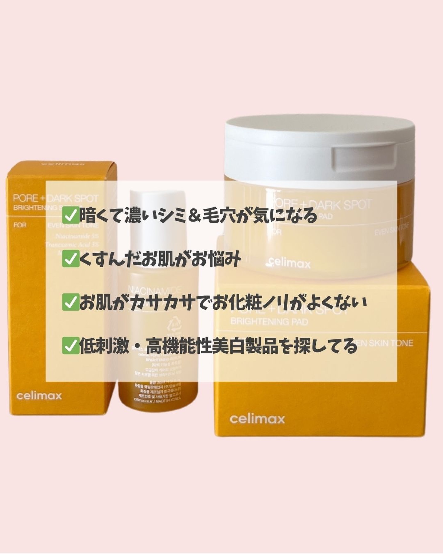 celimaxポアブライトニングシミケアシリーズ4種セット ¥7,390(celimax公式サイト)●ポアブライトニングセラム●ポアブライトニングシミケアパッド●ブライトニングクリーム●ブライトニングシミケア日焼け止め#PR#celimax#...