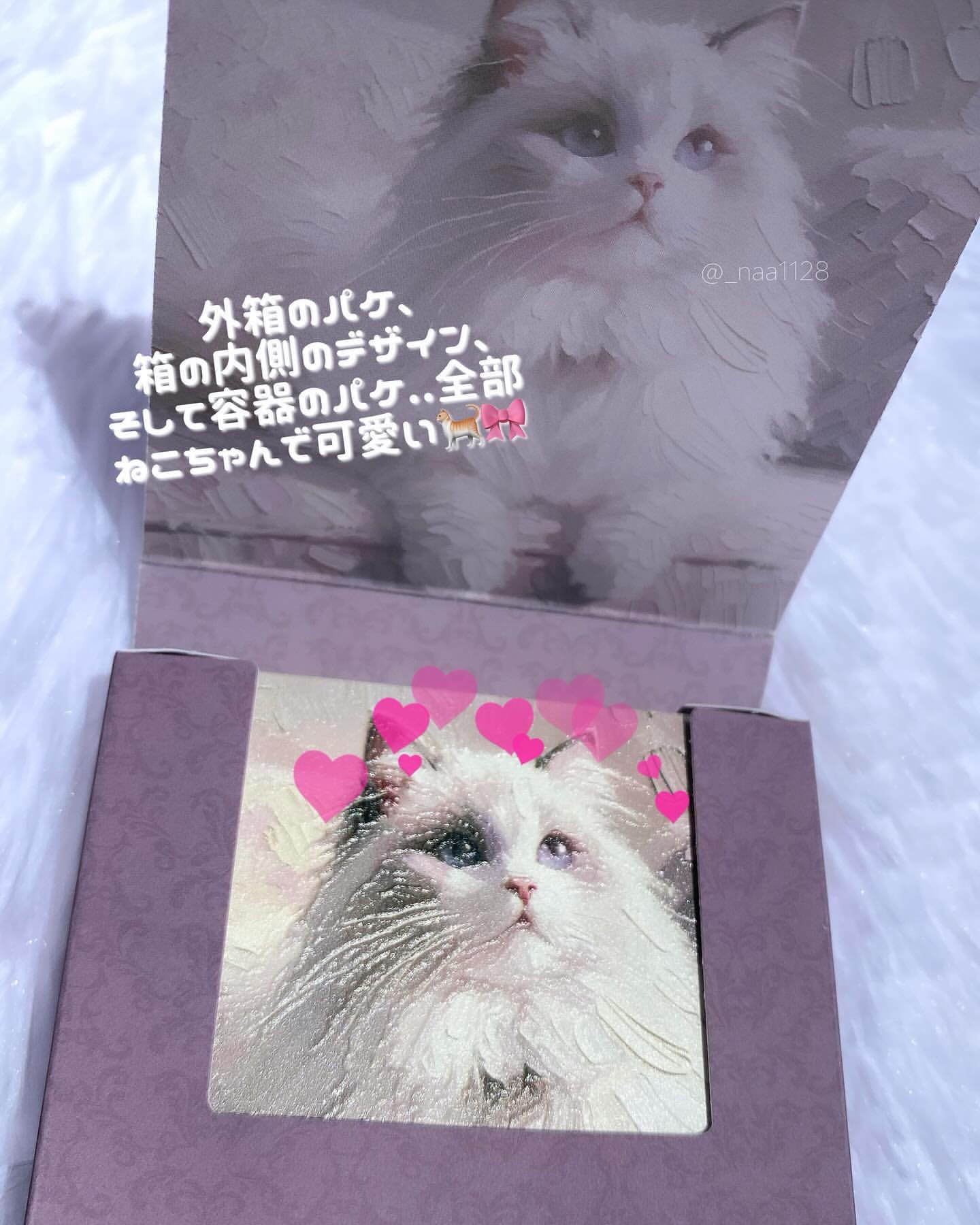 - <01 エキゾチックショートヘア> マイカ、ジメチコン、ホウケイ酸(Ca/Al)、合成フルオロフロゴパイト、酸化チタン、合成ワックス、酸化鉄、パルミチン酸エチルヘキシル、ポリメタクリル酸メチル、ステアリン酸亜鉛、パルミチン酸亜鉛、ポリブテン、ビスジグリセリルポリアシルアジペート-2、フェノキシエタノール、カプリリルグリコール、酢酸トコフェロール、酸化スズ、シリカ、クエン酸 <02 ラグドール> マイカ、ホウケイ酸(Ca/Al)、ジメチコン、合成フルオロフロゴパイト、酸化チタン、酸化鉄、パルミチン酸エチルヘキシル、合成ワックス、ステアリン酸亜鉛、ポリメタクリル酸メチル、パルミチン酸亜鉛、ポリブテン、ビスジグリセリルポリアシルアジペート-2、フェノキシエタノール、マンガンバイオレット、酢酸トコフェロール、カプリリルグリコール、酸化スズ、シリカ、赤226、クエン酸 <03 三毛猫> マイカ、ジメチコン、合成フルオロフロゴパイト、ホウケイ酸(Ca/Al)、酸化チタン、酸化鉄、パルミチン酸エチルヘキシル、合成ワックス、ポリメタクリル酸メチル、ステアリン酸亜鉛、パルミチン酸亜鉛、ポリブテン、ビスジグリセリルポリアシルアジペート-2、フェノキシエタノール、酢酸トコフェロール、カプリリルグリコール、コンジョウ、シリカ、酸化スズ、クエン酸 <04 ミヌエット> マイカ、ジメチコン、合成フルオロフロゴパイト、酸化チタン、酸化鉄、ポリメタクリル酸メチル、ホウケイ酸(Ca/Al)、パルミチン酸エチルヘキシル、合成ワックス、ステアリン酸亜鉛、パルミチン酸亜鉛、ポリブテン、ビスジグリセリルポリアシルアジペート-2、フェノキシエタノール、(ジメチコン/ビニルジメチコン)クロスポリマー、カプリリルグリコール、酢酸トコフェロール、シリカ、酸化スズ、クエン酸 <05 サイベリアン> ホウケイ酸(Ca/Al)、ジメチコン、合成フルオロフロゴパイト、マイカ、ポリメチルシルセスキオキサン、酸化チタン、パルミチン酸エチルヘキシル、シリカ、トリ(カプリル酸/カプリン酸)グリセリル、酸化鉄、リンゴ酸ジイソステアリル、窒化ホウ素、水酸化Al、合成ミツロウ、(ジメチコン/ビニルジメチコン)クロスポリマー、合成ワックス、ミリスチン酸Mg、ポリメタクリル酸メチル、ステアリン酸亜鉛、フェノキシエタノール、オゾケライト、(ビニルジメチコン/メチコンシルセスキオキサン)クロスポリマー、ナイロン-12、パルミチン酸亜鉛、カプリリルグリコール、ポリイソブテン、トリエトキシカプリリルシラン、メチコン、ビスステアリルジメチコン、ビスジグリセリルポリアシルアジペート-2、イソノナン酸イソノニル、黄4、酸化スズ、ビスPEG-18メチルエーテルジメチルシラン、ラウロイルリシン、ジエチルヘキサン酸ネオペンチルグリコール、赤202、ジメチコノール、トコフェロール <06 スコティッシュフォールド> ホウケイ酸(Ca/Al)、マイカ、シリカ、合成フルオロフロゴパイト、トリ(カプリル酸/カプリン酸)グリセリル、リンゴ酸ジイソステアリル、酸化鉄、窒化ホウ素、パルミチン酸エチルヘキシル、酸化チタン、ホウケイ酸(Ca/Na)、ミリスチン酸Mg、水酸化Al、合成ワックス、ジメチコン、合成ミツロウ、ナイロン-12、フェノキシエタノール、オゾケライト、トリエトキシカプリリルシラン、メチコン、イソノナン酸イソノニル、カプリリルグリコール、ビスステアリルジメチコン、(ジメチコン/ビニルジメチコン)クロスポリマー、ラウロイルリシン、ビスPEG-18メチルエーテルジメチルシラン、酸化スズ、ジエチルヘキサン酸ネオペンチルグリコール、ジメチコノール、トコフェロール <07 アメリカンショートヘア> タルク、マイカ、窒化ホウ素、合成フルオロフロゴパイト、酸化チタン、シリカ、ホウケイ酸(Ca/Al)、ポリメタクリル酸メチル、ナイロン-12、ミリスチン酸Mg、トリ(カプリル酸/カプリン酸)グリセリル、合成ワックス、イソノナン酸イソノニル、酸化鉄、パルミチン酸エチルヘキシル、リンゴ酸ジイソステアリル、フェニルトリメチコン、ジメチコン、トリエトキシカプリリルシラン、オキシ塩化ビスマス、フェノキシエタノール、ラウロイルリシン、カプリリルグリコール、水酸化Al、メチコン、酸化スズ、酢酸トコフェロール、赤202、アルミナ、青1、黄4