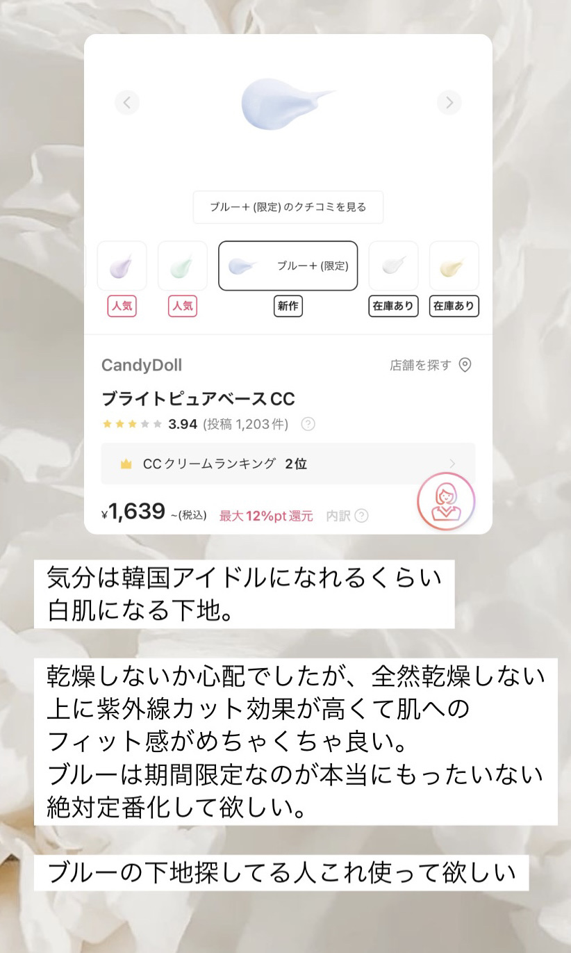 | CCクリームランキング第10位 | 手で馴染ませるとピンク色に!ラメも入ってるので、顔にのせると輝くようなお肌に♡ | 詳細を見る |