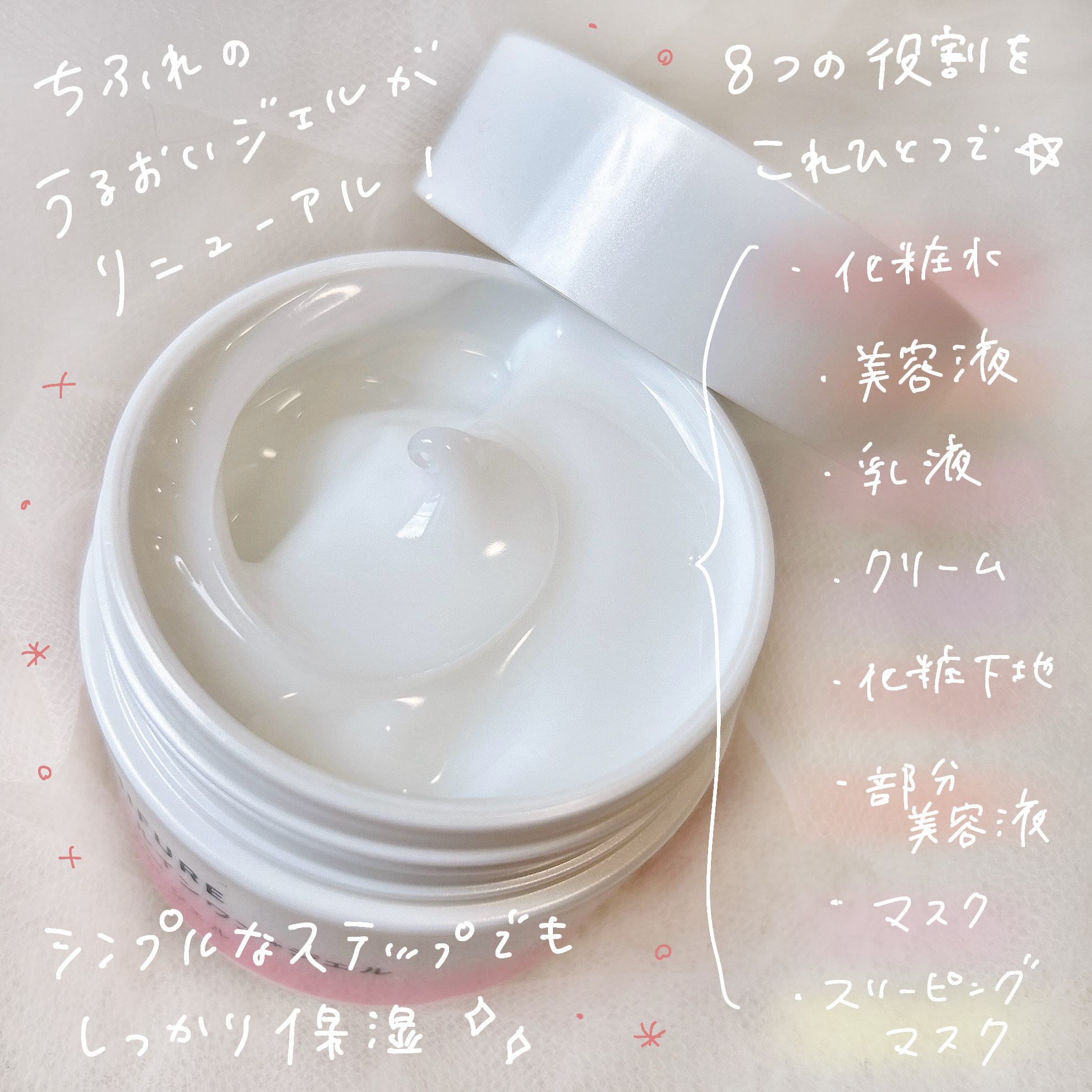 - ふっくらとしたジェルが心地よくぴたっと密着。 1品でもっちり肌がずっとつづく、高保湿オールインワン。