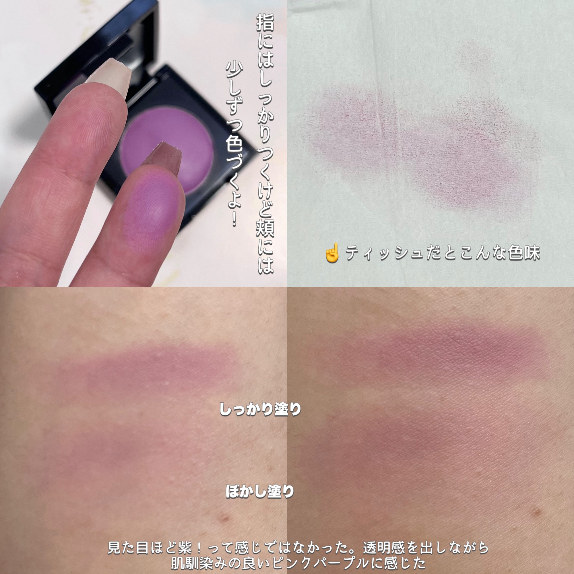 生っぽいぷにぷに質感のチーク。粉質はしっとりしていてするする伸びるよ。 透け感のあるきれいな発色。重ねても濁らないから淡いチークもしっかり発色のチークもどちらも簡単にできるよ。 気になる人は試してみてね💜