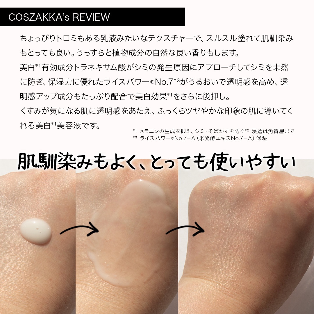 - 【美白有効成分】 トラネキサム酸 【保湿成分】 ライスパワー®No.7 【透明感アップ(保湿)成分】 米ぬか酵素分解エキス/イネ葉エキス/ハトムギ発酵液/発酵ヒアルロン酸/グリコシルトレハロース/乳酸Na/グリセリン 全成分 トラネキサム酸※、 精製水、1,3-ブチレングリコール、エタノール、濃グリセリン、ジプロピレングリコール、ライスパワー®No.7-A(米発酵エキスNo.7-A)、ジカプリン酸プロピレングリコール、α-オレフィンオリゴマー、d-δ-トコフェロール、イネ出穂前葉抽出加水分解物、グリコシルトレハロース・水添デンプン分解物混合溶液、セイヨウナシ果汁発酵液、チャエキス(1)、ハトムギ発酵液、ヒアルロン酸ナトリウム(2)、加水分解コメヌカエキス、アクリル酸ナトリウム・アクリロイルジメチルタウリン酸ナトリウム共重合体/イソヘキサデカン/ポリソルベート80、エデト酸二ナトリウム、オレイン酸エチル、カルボキシビニルポリマー、キサンタンガム、グリセリン脂肪酸エステル、ジペンタエリトリット脂肪酸エステル(1)、セトステアリルアルコール、ナイロン末、ピロ亜硫酸ナトリウム、ベヘニルアルコール、メチルポリシロキサン、モノオレイン酸ソルビタン、モノステアリン酸ポリエチレングリコール、リン酸一水素ナトリウム、リン酸二水素ナトリウム、水酸化ナトリウム、乳酸ナトリウム液、エチルパラベン、フェノキシエタノール、メチルパラベン、カラメル ※有効成分 無印:その他の成分 ライスパワー®TMNo.7(ライスパワー®No.7-A(米発酵エキスNo.7-A))、発酵ヒアルロン酸(ヒアルロン酸ナトリウム(2))、米ぬか酵素分解エキス(加水分解コメヌカエキス)、イネ葉エキス(イネ出穂前葉抽出加水分解物)、白茶エキス(チャエキス(1))、洋ナシ果汁発酵エキス(セイヨウナシ果汁発酵液)、乳酸Na(乳酸ナトリウム液)、グリコシルトレハロース(グリコシルトレハロース・水添デンプン分解物混合溶液)