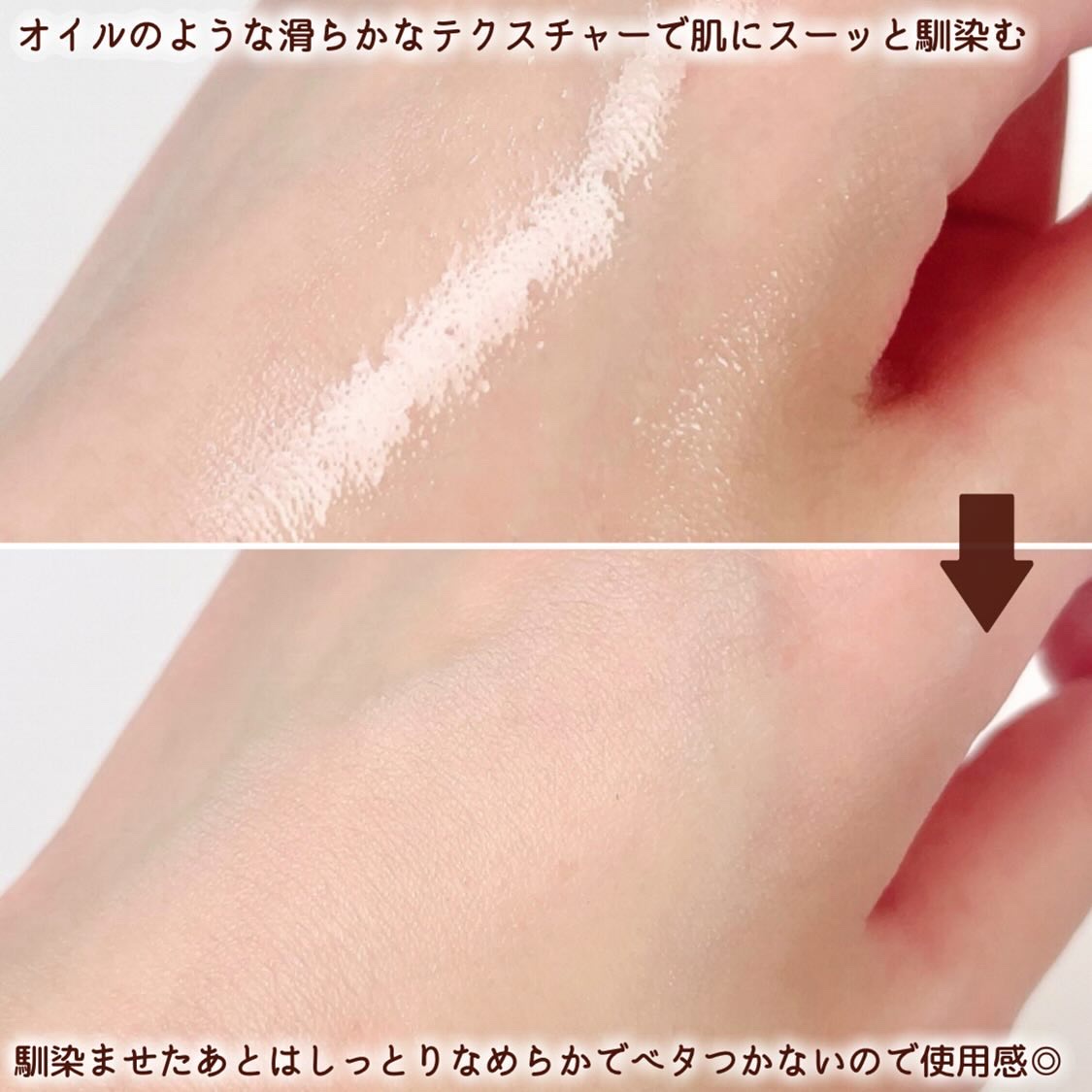 このリップは塗布後しばらくするとゲル層とシリコーン層の2層膜を形成!! ゲル層が唇にピタッと密着することで高いラスティング効果を実現し擦れに強く長時間色持ちをキープ!! そして塗布膜表面のシリコーン層が高い透明感と程よいツヤ感を演出してくれるんです😊 スルスルっと軽くなめらかな塗り心地で、唇にピタッと色が密着してくれている感じがすごいする✨ 1度塗りでも十分なくらい発色がとてもよく、ムラなく均一に綺麗に塗れるのがとても良き🙆♀️ 塗ってから60秒何もせずに待つと色持ちがUP!! 軽くティッシュオフしても色味が全然落ちないのが感動😭ツヤ感は落ちてしまうけど… 5種のオーガニック植物抽出成分を配合したり、アルコール等を使用してないので唇にも優しいので唇が荒れやすい方にもオススメです☺️