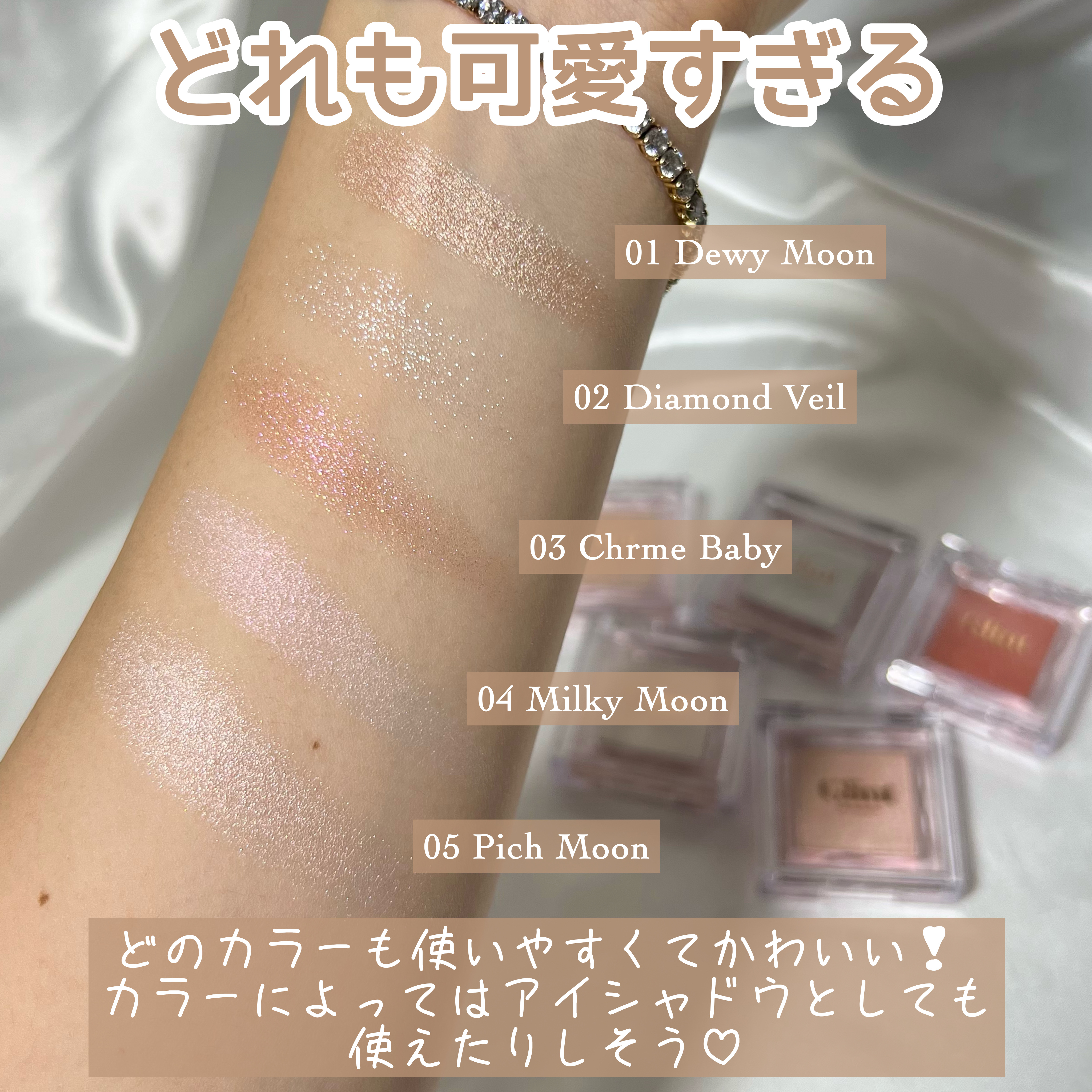 - <Dewy Moon> 合成フルオロフロゴパイト、酸化チタン、マイカ、(HDI/トリメチロールヘキシルラクトン) クロスポリマー、シリカ、リン酸Ca、ジメチコン、酸化鉄、グリセリン、トリエトキシカプリリルシラン、パルミチン酸イソプロピル、ケイ酸(AL/Mg)、ペンチレングリコール、ミリスチン酸Mg、ポリソルベート20、ステアロイルオキシステアリン酸オクチルドデシル、(アクリルアミド/アクリロイルジメチルタウリンNa/アクリル酸)コポリマー、デヒドロ酢酸Na、オリーブ油脂肪酸ソルビタン、ステアリン酸ソルビタン、イソヘキサデカン、フェノキシエタノール、ソルビン酸K、エチルヘキシルグリセリン、ポリソルベート80、オレイン酸ソルビタン、トコフェロール <Chrome Baby> マイカ、ホウケイ酸(Ca/Al)、シリカ、酸化チタン、オクチルドデカノール、ジメチコン、(ジフェニルジメチコン/ビニルジフェニルジメチコン/シルセスキオキサン) クロスポリマー、酸化鉄、グリセリン、ミリスチン酸Mg、(HDI/トリメチロールヘキシルラクトン)クロスポリマパルミチン酸イソプロピル、グンジョウ、ペンチレングリコール、ケイ酸(AL/Mg)、ポリソルベート20、赤226、ステアロイルオキシステアリン酸オクチルドデシル、酸化スズ、(アクリルアミド/アクリロイルジメチルタウリンNa/アクリル酸)コポリマー、トリエトキシカプリリルシラン、オリーブ油脂肪酸ソルビタン、ステアリン酸ソルビタン、イソヘキサデカン、フェノキシエタノエール、デヒドロ酢酸Na、ソルビン酸K、エチルヘキシルグリセリン、カオリン、ポリソルベート80オレイン酸ソルビタン、トコフェロール <Milky Moon> マイカ、酸化チタン、(HDI/トリメチロールヘキシルラクトン) クロスポリマー、ジメチコン、合成フルオロフロゴパイト、シリカ、エチルヘキサン酸セチル、グリセリン、パルミチン酸イソプロピル、ペンチレングリコール、ケイ酸(AL/Mg)、トリエトキシカプリリルシラン、ポリメチルシルセスキオキサン、ミリスチン酸Mg、ポリソルベート20、ステアロイルオキシステアリン酸オクチルドデシル、(アクリルアミド/アクリロイルジメチルタウリンNa/アクリル酸)コポリマー、オリーブ油脂肪酸ソルビタン、ステアリン酸ソルビタン、デヒドロ酢酸Na、イソヘキサデカン、フェノキシエタノール、ソルビン酸K、エチルヘキシルグリセ リン、酸化スズ、ポリソルベート80、オレイン酸ソルビタン、トコフェロール
