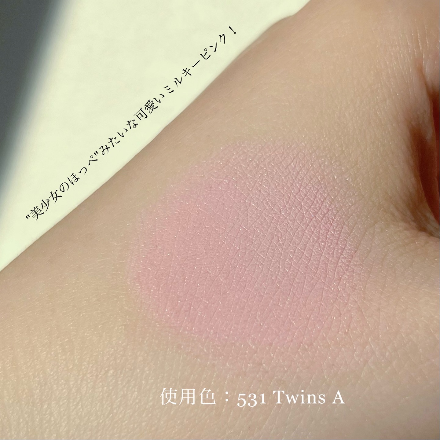 - <531 Twins A> タルク、チタンジオキシド、マイカ、ポリメチルメタクリレート、ラウロイシン、赤色202号、オクチルドデシルステアロイルステアレート、ダイアイソステアリールマレート、ダイメティコン、アイソセチルミリステイト、マグネシウムミリステイト、カプリリルグリコール、トライエトキシカプリリルシレイン、赤226号、グリセリルカプリレート、エチルヘキシルグリセリン、ハイドロゼネティドレシチン、精製水、ナトリウムクロライド、ナトリウムサルフェート、トコフェロール <532 Twins B> トリメリト酸トリトリデシル、シリカ、ビスジグリセリルポリアシルアジペート-2、オクチルドデカノール、ジメチコン、トリイソステアリン酸ポリグリセリ-2、トリ(カプリル/カプリン酸)グリセリル、酸化チタン、キャンデリラロウ、合成ワックス、マイカ、CI 77492、1,2-ヘキサンジオール、ポリヒドロキシステアリン酸、赤色104号の(1)、ヒドロキシアセトフェノン、レシチン、メチコン、イソステアリン酸、パルミチン酸エチルヘキシル、黄色5号、ポリリシノレイン酸ポリグリセリル-3、赤色202号