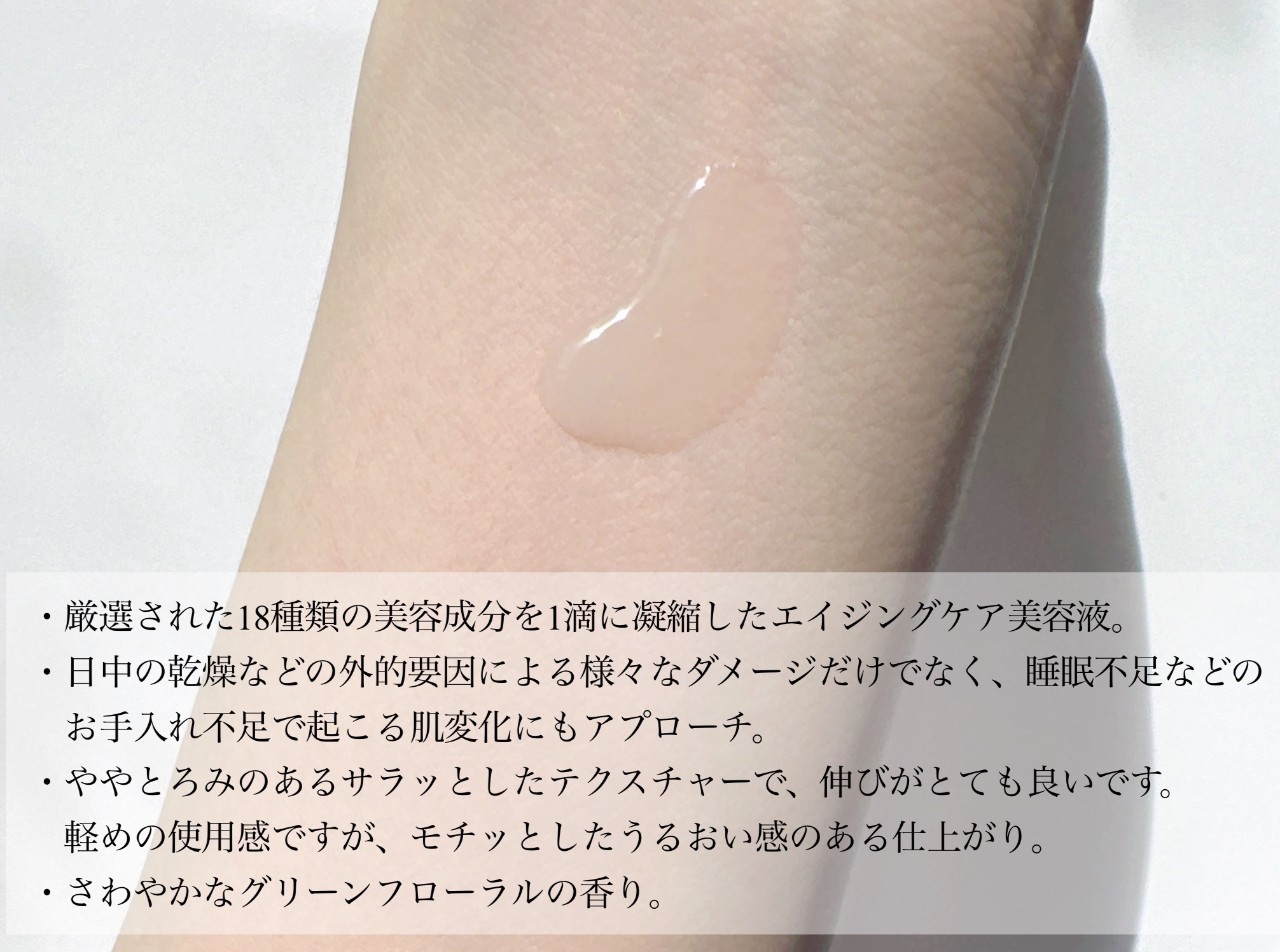 - 365日。美しさを更新。 生命感あふれるつややかな肌と、未来へ。 厳選された18種類の美容成分を1滴に凝縮し、たっぷりうるおいを与え、エイジングケア*する美容液。 絶え間なくうるおい満ちるつや、なめらかさ、ハリを引き出します。 *年齢に応じたうるおいによるお手入れのこと グリーンフローラルの香り