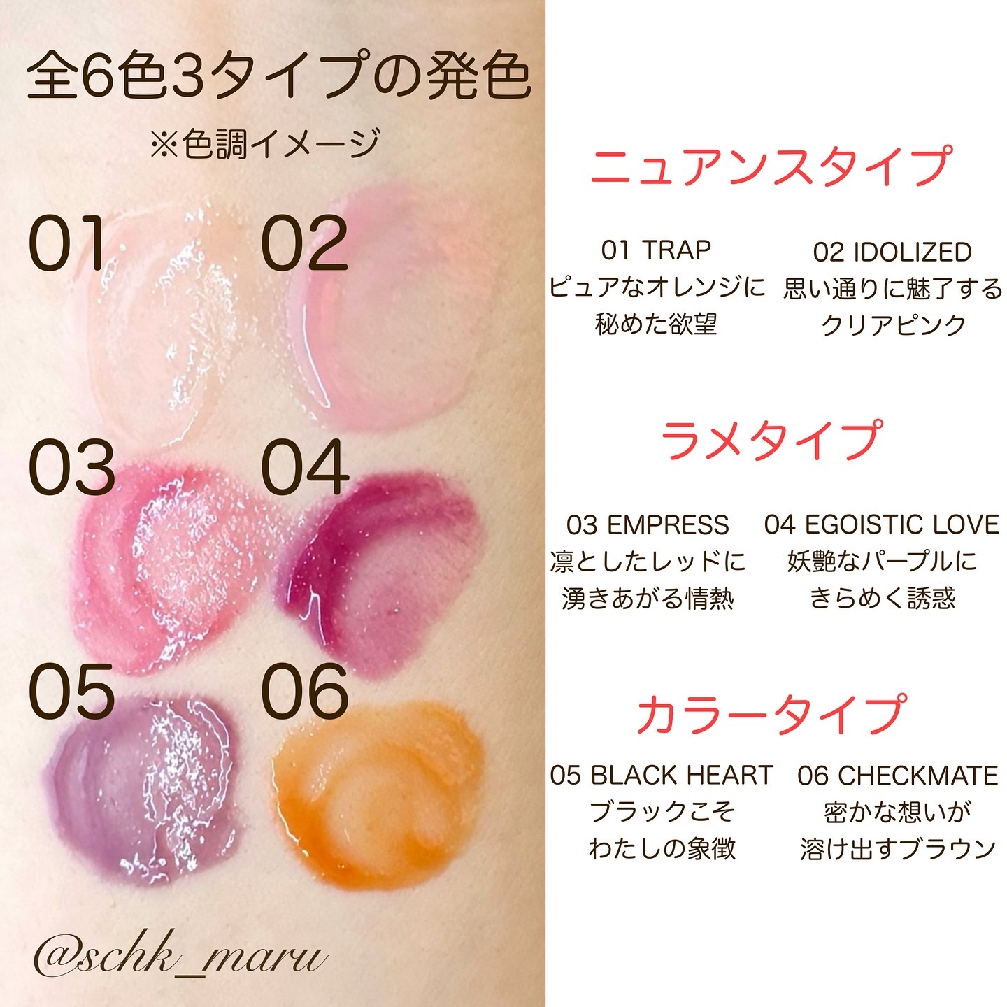 - 誰しもがもつ内に秘めた本性や欲望を色鮮やかに表現し、新たな魅力を引き出す“美と神秘”が織りなす世界観をイメージしたリップオイルを数量限定で発売。 同商品は、まるでとろりとした“蜜”のような透明感とテクスチャーを叶える“蜜オイル”を採用。 高い透明感と密着感により、透けるような発色とツヤ、うるおい感を演出します。 また、夏の唇は紫外線やエアコンの影響により乾燥しがちなことに着目。保湿成分サフラワー油を配合し、唇にうるおいを与えます。 “蜜”のような透明感の中に隠された色鮮やかなカラーを好奇心のおもむくまま纏うことで、自身でも気づいていない内に秘めた新たな魅力を引き出す特別な限定リップオイルをお届けします。