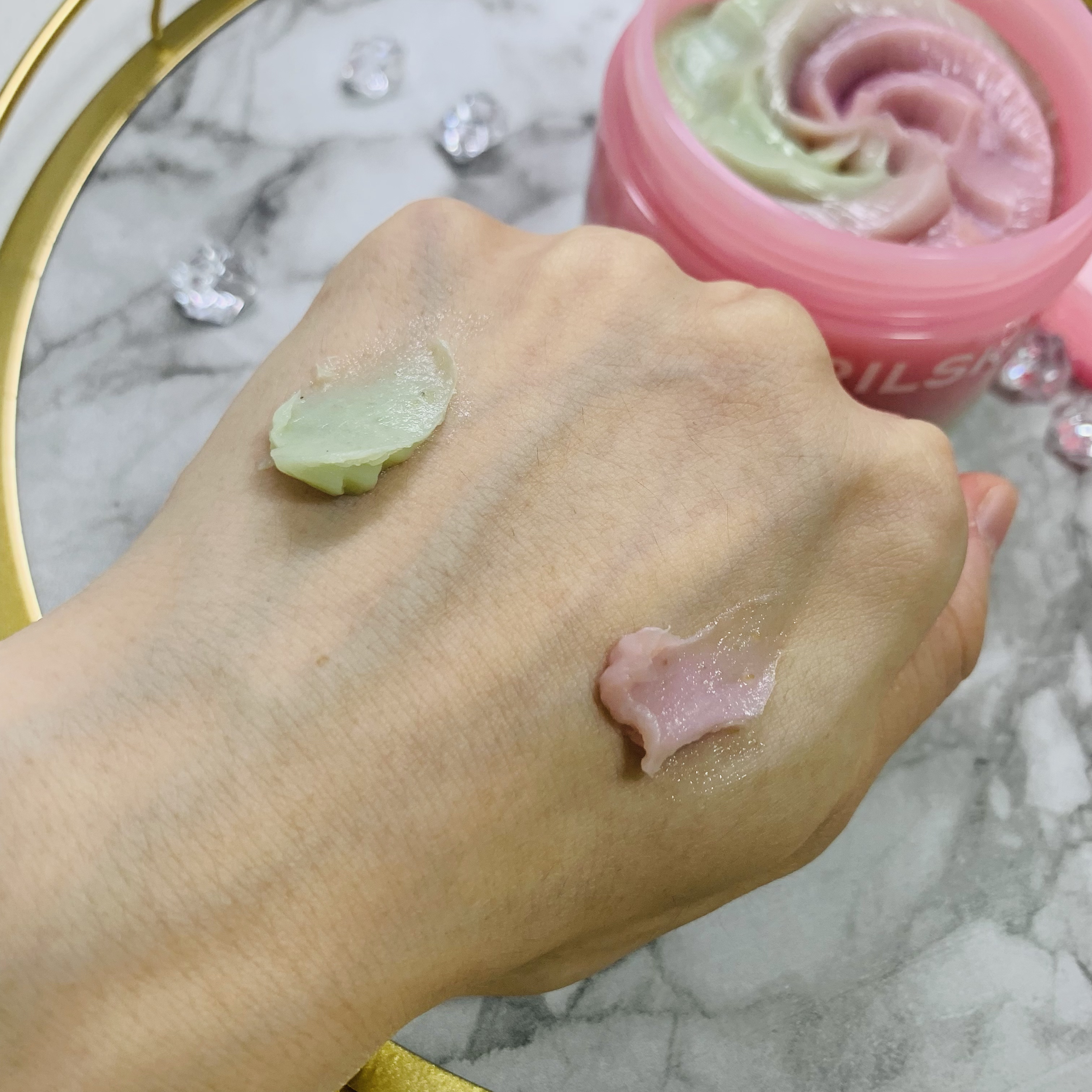 APRILSKINピンクアロエメレンゲクレンザー洗顔、パックにも使える新感覚2wayクレンザー🫧ピンクアロエや豆スクラブ、グリーンの部分はツボクサエキスや緑豆スクラブなどが配合されてるみたい🌿✨肌表面のザラつきを滑らかにしてくれて、汚れもスッ...