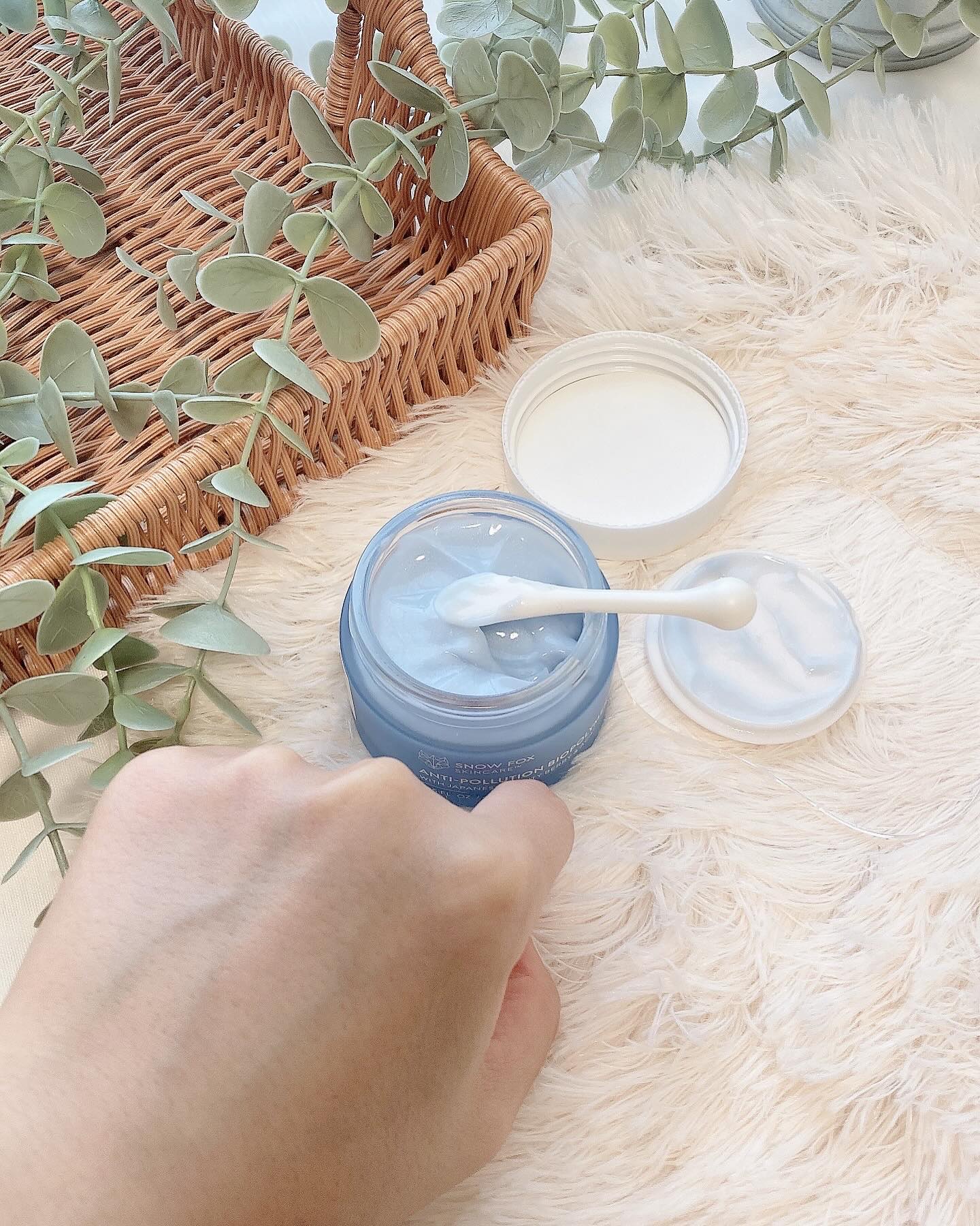 クリームとセラムの両方の用途を兼ね添えたスキンケアなの! なんてかわいいパールがかったブルーなんだろう〜!! 外部からの刺激やストレスから守ってくれるお守りスキンケアになりそうだね♡