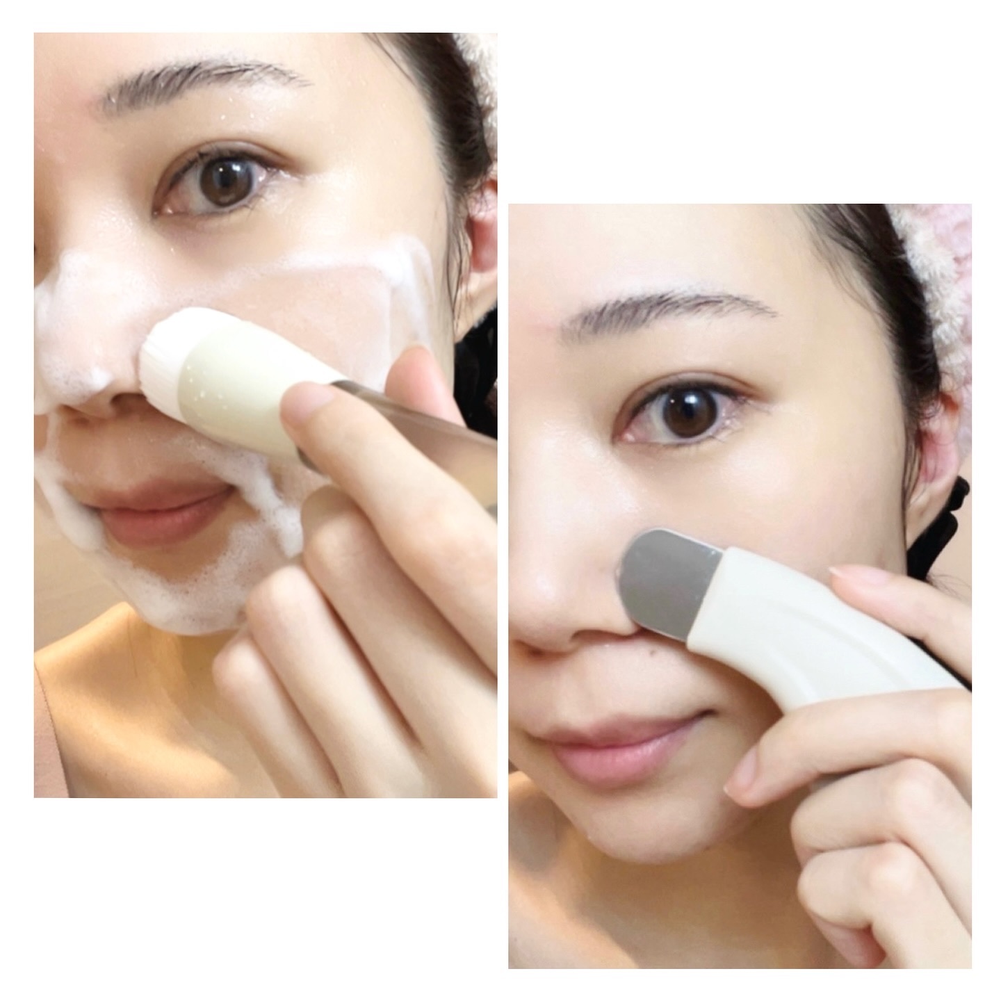 やわらかい質感のブラシで肌に負担を感じずケアできるよ😊 斜めにカットされた形状で肌に沿わせやすく、小鼻にも使いやすい🤍 毛穴汚れをやさしく押し出すクリーナー🍀 クレンジングや洗顔後の濡れた状態の肌に使うよ🙌🏻 カーブになっているスパチュラで細かい部分にもフィットする🧡 使用後は洗い流したあと、しっかり保湿ケアするのがいいみたい🫧