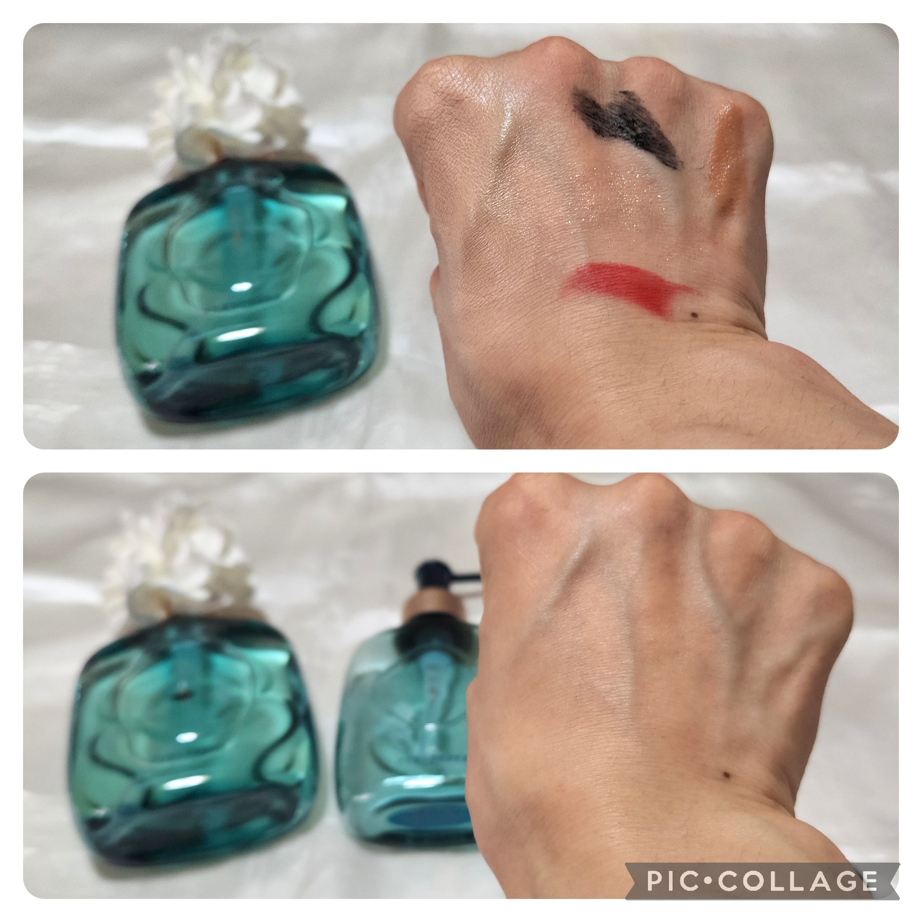 パフで出した時は3色分かれて出てくるけど、肌に乗せると混ざり合って透明感が出ます。 付属のブラシで使ってみたら均一に、透明感のあるサラサラとしたお肌になりました。 ブラシの時は、本体は少し斜めにして粉を出してました。肌に乗せるとナチュラルにツヤッとした感じがいいなと思います。