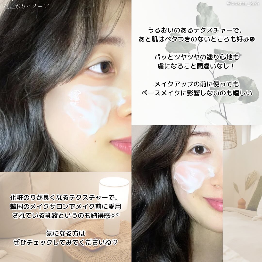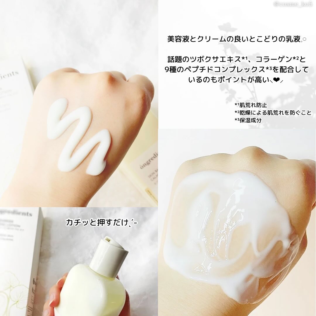 - 韓国のメイクサロンで、メイク前のスキンケアに採用された実力派乳液。 ツボクサエキス配合*1で肌荒れ予防*2をサポートし乾燥による外的刺激を受けやすい敏感なお肌にもお使いいただけます。 さらに、コラーゲン*3と9種のペプチドコンプレックス*3が長時間しっとり&もっちりとした質感のお肌に。 さっぱりとした使い心地でベタつきを感じにくく、メイク前のスキンケアにもぴったり。 重ねて塗布することでお肌に浸透*4しより潤いをあたえ、ツヤ感のあるお肌へとサポートします。 *1 肌荒れ防止 *2 乾燥による肌荒れを防ぐこと *3 保湿成分 *4 角質層まで