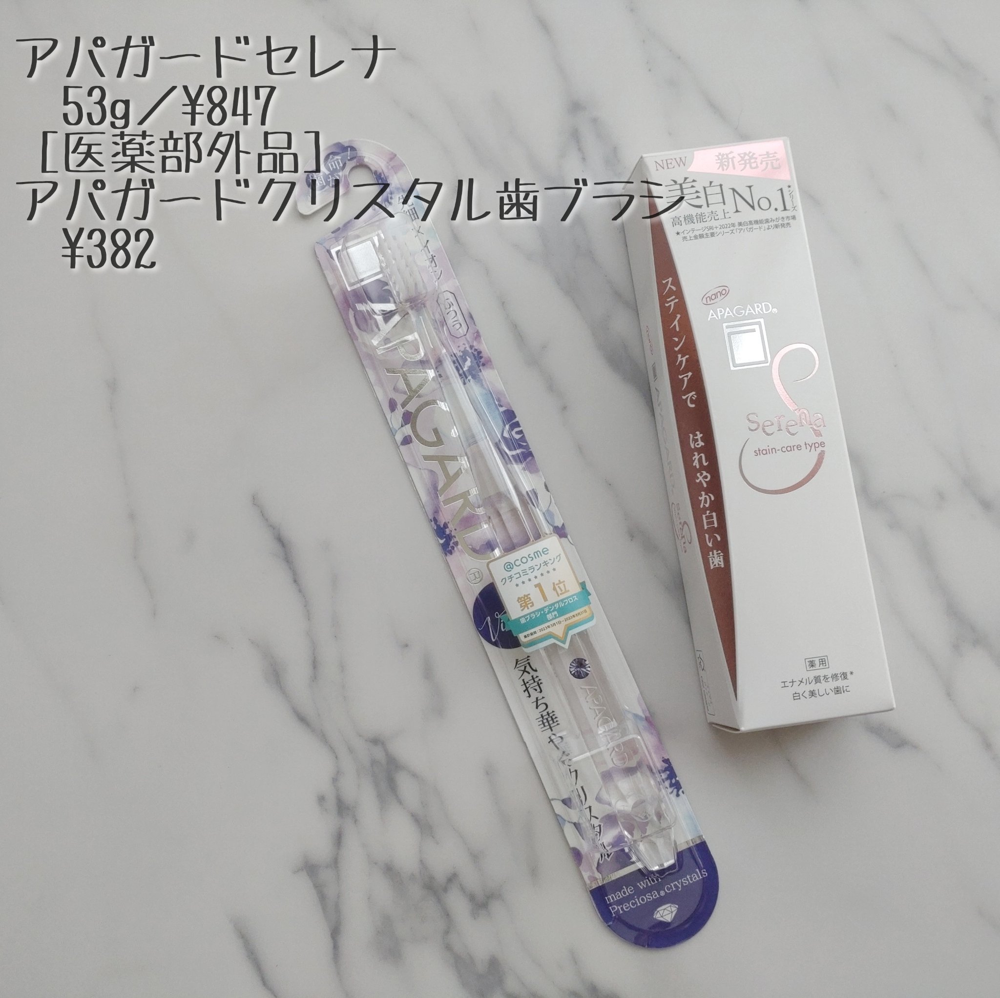 株式会社サンギさまからいただきましたアパガードセレナアパガードクリスタル歯ブラシ医薬部外品/薬用歯みがき 販売名:サンギMSRコーヒー、紅茶、ワインなどのステインをしっかりケアステインケアではれやか白い歯に毎日の歯みがきでステインを落とす2つ...