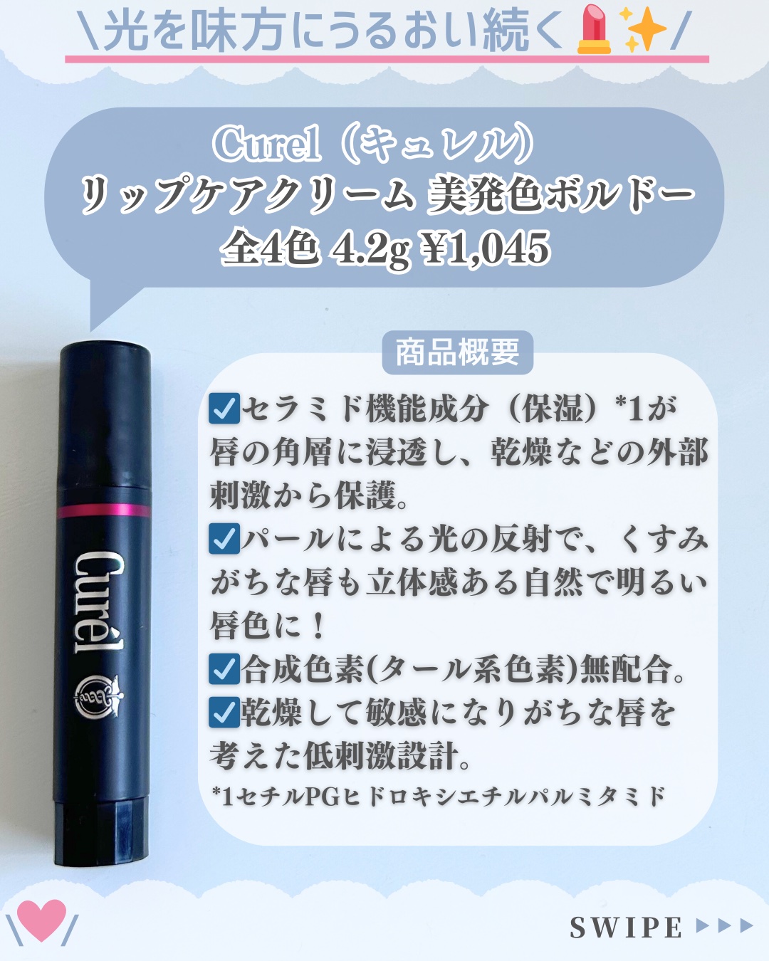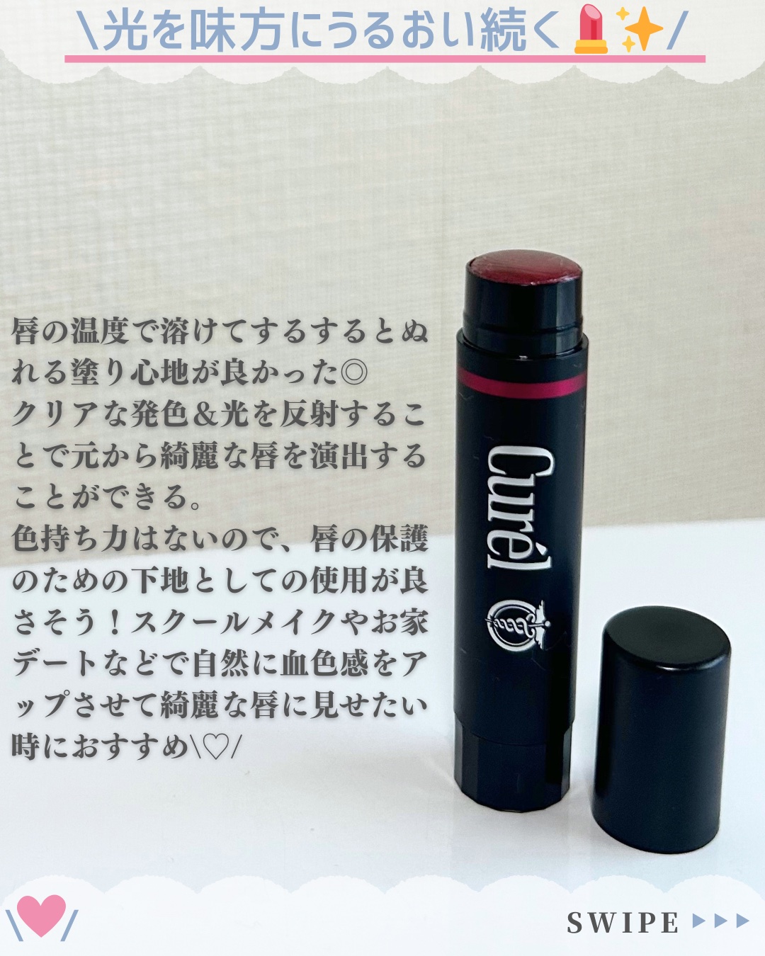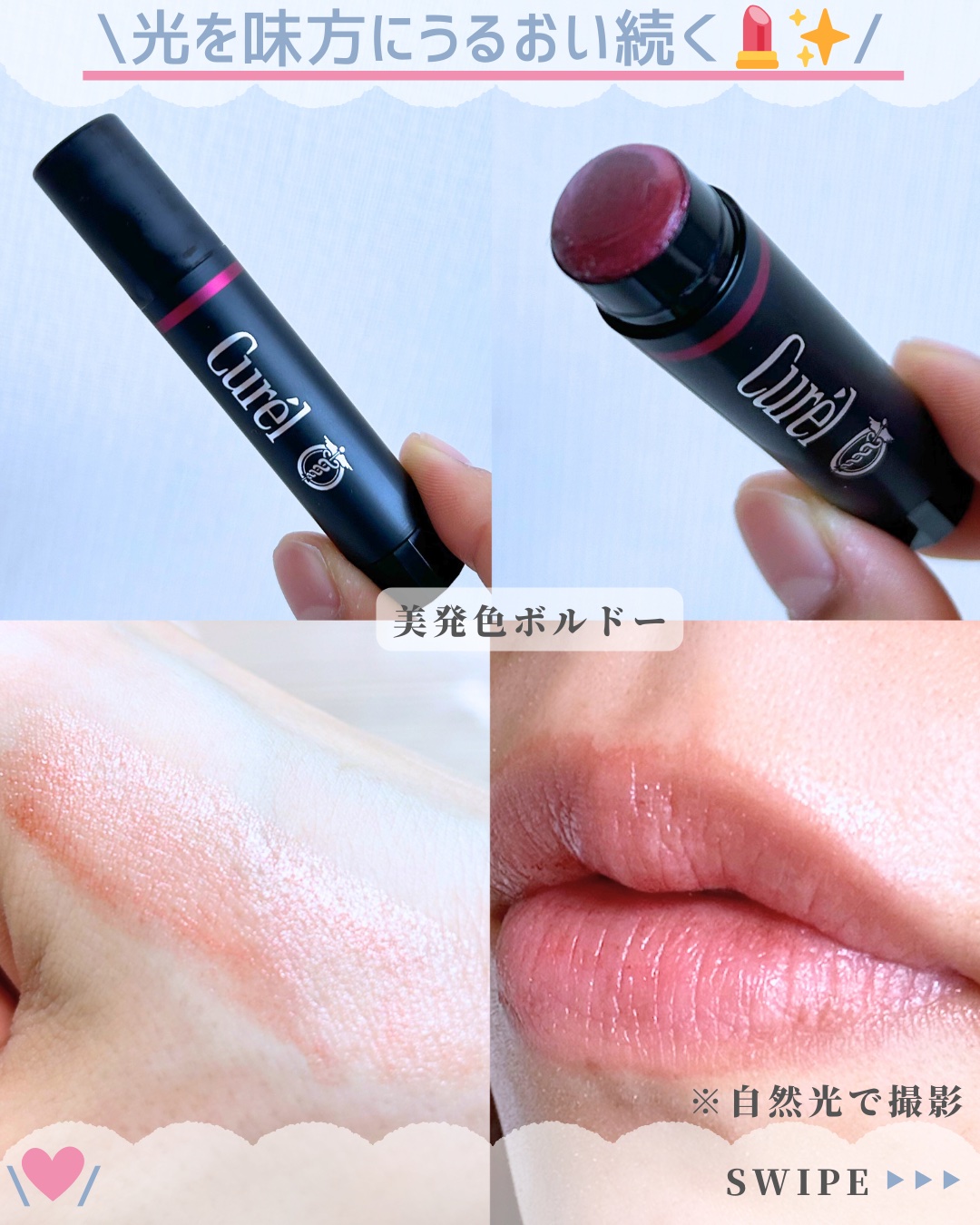 乾燥して敏感な唇でもカラーを楽しめる、キュレルのカラーリップ♡ 美発色ボルドーは唇のくすみ悩みがあり濃い唇色の方にオススメなんだそう💋 するんとなめらかな塗り心地で、自然な血色感💕 縦じわも目立ちにくくて健康的な唇に見えるような仕上がり💕 ナイトリップとして使用中🌙 伸び、なじみ、密着感が良い💕 乾燥を防いでくれそうな使用感です❄️