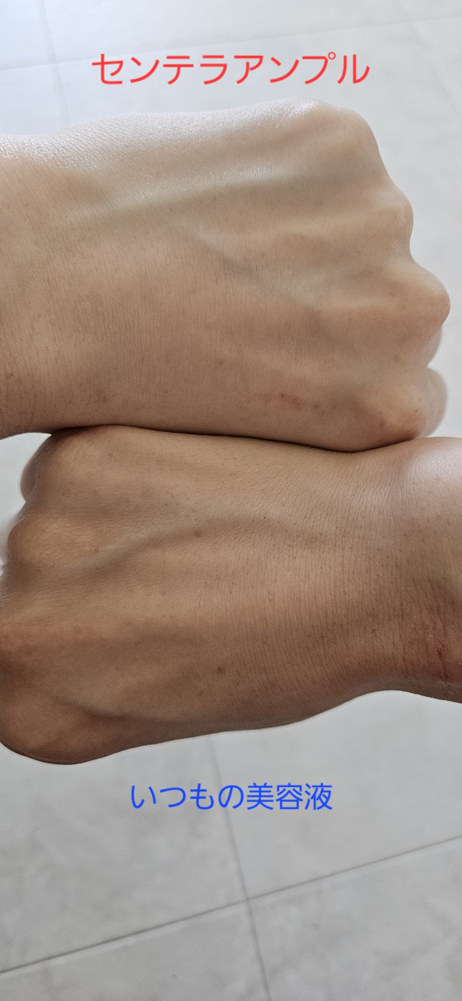 このセンテラトーンブライトニング カプセルアンプルの鎮静効果とトーンアップ効果。 つぶつぶが良さそう☆ 手に取ると、とろみのあるテクスチャで、伸ばすとサラサラ。 つぶがプチプチして、つぶれても違和感なくスーッと肌に馴染みました!!! 塗ったあとはモチモチ! 敏感肌の私にも合うし、他のスキンケアとも相性良く、匂いもないので使いやすい。