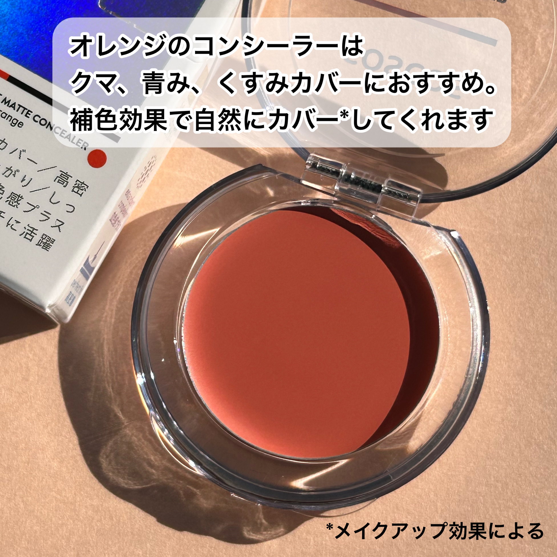 - オレンジを仕込んでクマ・青み・くすみを瞬時にカバー(※1) 目元の気になるクマや眉・髭の青みを瞬時にカバーするコンシーラー。 マットなオレンジカラーが、青クマ・青みを強力色補正。 高密着で厚塗りすることなく、自然に肌悩みを隠して血色感アップ! ●強力色調補正 濃いクマや髭の青みにも負けない! 対照色であるオレンジの補色効果で自然かつ強力にカバー ●ヨレない密着力 半練りタイプで肌にピタッと密着 上からファンデーションをのせてもよれずにナチュラルにカバー ●マルチに活躍 保湿成分配合でお肌に優しい使い心地でアイメイクが可能 チーク、リップにも使えてひとつでオレンジメイクが叶う ●注目の「CICA(※2)スキンバリア成分」配合 CICA(※2)スキンバリア成分を新たに配合し、メイクしながらしっかりお肌を守るスキンケア効果をプラス ●乾燥しがちな目元もしっかり保湿 潤いを与えてくれる美容成分配合(※3) ※1.メーキャップ効果による ※2.ツボクサエキス(保湿成分) ※3.ヒアルロン酸、加水分解コラーゲン(保湿成分)