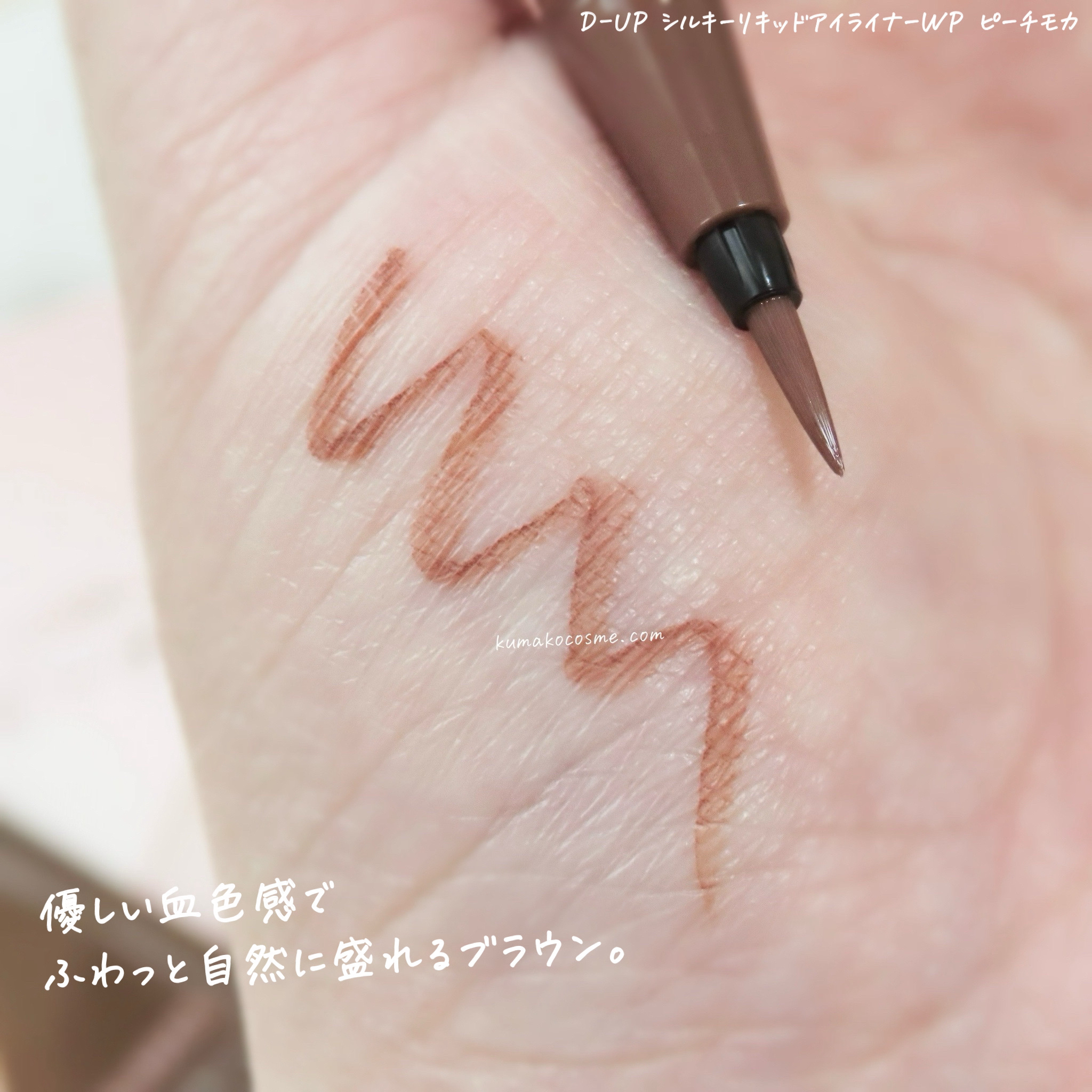 - 筆先までずっとなめらか、目尻で感動するリキッドアイライナー。 必要な量が肌にのる新設計で、まぶたの上をすべるような、滑らかな描き心地。しなやかでコシのある筆が、筆圧のコントロールを容易にし、太いラインも細いラインも思い通りに仕上げます。水、汗、涙に強いウォータープルーフタイプなのに、通常洗顔で簡単オフ。肌に色素が残らない顔料を使用。5種類の美容液成分を従来品の200%配合し、メイクしながら目元ケアまで。 ●ブラウンブラック ※2020年9月12日 バラエティショップ先行発売 ●漆黒ブラック ※2020年12月頃発売予定 ●ナチュラルブラウン ※2020年12月頃発売予定 ●シフォンブラウン 「毎日メイクに透明感と抜け感」 ブラウンでも、グレーでも、ベージュでもないニュアンスカラー。 自然な印影で素の目元を際立て、頑張りすぎない、ふんわりとした目元に。 ●アプリコットブラウン 「じゅわっと血色感。 肌に馴染むおしゃれカラー」 温かみのあるアプリコットがじゅわっと滲む血色感を目元に演出。 肌馴染みが良いので、カラーライナーに抵抗がある方もブラウンの延長線上で楽しめる、使いやすい色味です。 ”ちょっとオシャレ”な空気感を演出するカラー。 ●ピンクショコラ アイライナー 「ピンクが溶け込む濃厚ブラウン」 肌馴染みが良く、目元にじんわり血色感をプラス。 さりげなく女性らしさが加速するようなカラー。 ●ピスタチオラテ (2022年7月29日(金)発売) 「“目尻”に抜け感アクセント」 肌に馴染むのに映える絶妙なグリーン。 トレンドカラーに“くすみ”と“抜け感”をプラスしたまろやかな発色。 ●マスタードブラウン 「“イエロー”が揺れる、大人の洒落色」 (2022年7月29日(金)発売) まるで太陽のような暖かさを感じる新しいブラウン。 ほんのり感じるイエローでメイクが一気に垢抜ける稀有な色。 ●シフォンピンク(2023年2月10日発売) 「ふんわり柔らか"まろみピンク"」 甘くなりすぎない青みニュアンスで目元の透明感UP。 目元を引き締め、ピンクメイクにありがちな腫れぼったさを解消。 ●ミルクカプチーノ(2023年4月21日発売) まろやかな深みの“優しい締め色” どんなメイクにも合わせやすいカラー。 自然な陰影でさりげなく目幅を拡張します。 ●グレーカシミア(2023年10月1日発売) ブラウンがほんのり溶け込んだ、暖色グレー まろやかな発色で、パーソナルカラーを問わず肌に馴染む 目元の陰影になりすまし、抜け感と目力を欲張りに叶える ●ダークフィグ(2024年6月1日発売) するする”なめらか。描きやすいのに、落ちにくい。 クッキリ可愛いほの甘ダークブラウン ●ピーチモカ(2024年8月1日発売) ふわっと自然に盛れる“桃色ブラウン” ほんのり血色感で目元にうるみ感を演出 ●スターダストブラウン(2024年12月11日発売) キラッと繊細に輝く''星屑ブラウン'' 透け感のあるダークブラウンの色味とラメの輝きが、目元に艶のある立体感を演出 ●チャコールモカ(2025年4月10日発売) 目元を締める''深みグレージュ'' 黄みや赤みに偏りすぎない絶妙な色設計で、自然に目元を強調