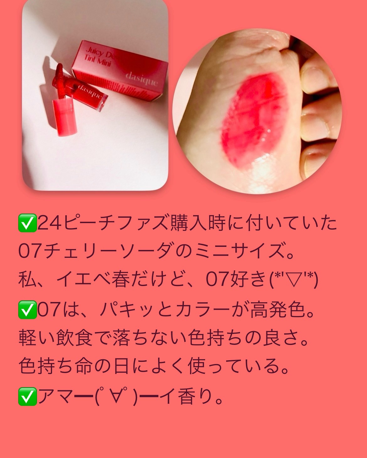 \さくらんぼレッド🍒/♡dasiqueJuicyDewyTint07CherrySoda熟した赤い桜桃色を入れたチェリー色のレッドカラー。蛍光感が強い、ピンクみがかった鮮やかな赤色❤️ブルベ向きのカラーで、鮮やかなパキッとした発色だから、肌が...