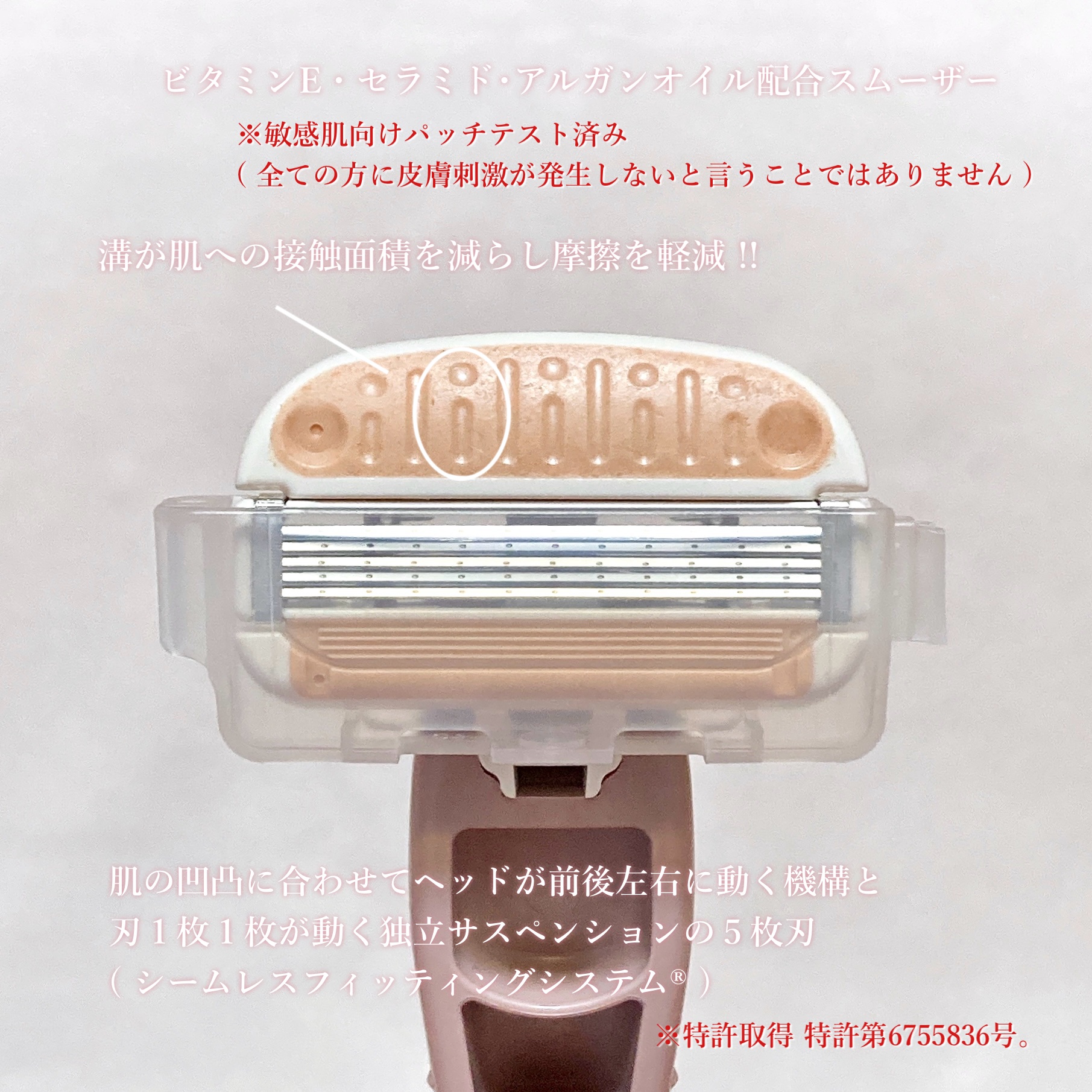 - ストレスのない使用感を追求した部位特化型のブランド セルフケアの「わからない」「上手くできない」がなくなるように、わかりやすさや使いやすさ、肌へのやさしさにこだわりました。 ・刃部は肌の凹凸に合わせてヘッドが左右前後に動く首振り機構※1と、刃1枚1枚が動く独立サスペンションの5枚刃(シームレスフィッティングシステム®) ・ビタミンE・セラミド・アルガンオイル配合スムーザー※2 ・長くも短くも持つことができるロングハンドル ・ハンドルは吊るして保管ができるフック形状※3 ・厚みのあるハンドル形状で、後ろ手でも横ブレしにくく安定して操作しやすい ・替刃はボディ用カミソリ、うで・あし用カミソリとの互換性あり ※1 特許取得 特許第6755836号 ※2 敏感肌向けパッチテスト済み (すべての方に皮膚刺激が発生しないということではありません) ※3 意匠権取得 意匠登録第1752452号