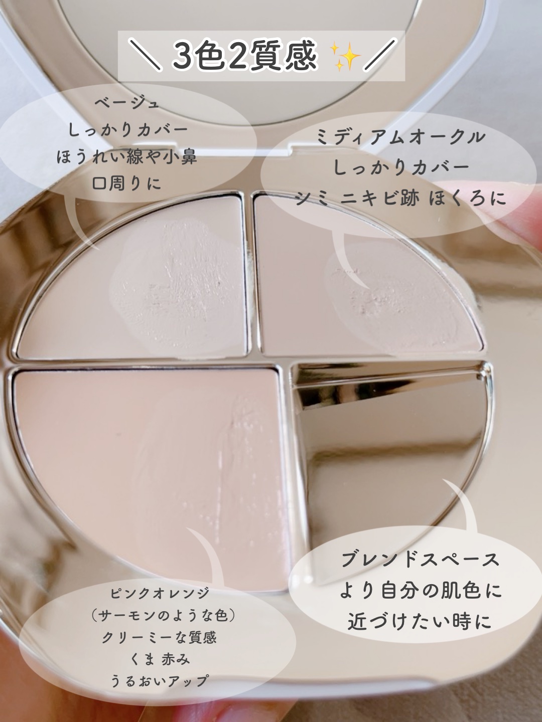 - 様々な肌悩みにアプローチして開発された三色一体型コンシーラーパレット。 3つのカラー、2つのテクスチャーがお悩み別にアプローチ、シームレスな美しい肌に仕上げる。パレットのカラーはクールトーンとウォームトーンを兼ね備えているため、メイク初心者の方でも色選びに悩まずにメイク可能。 さらに、右下部分に斜めのパレットが設計、パレットで3つのカラーを調合して使うことで自分好みの色を調合することができ、様々なお悩みを解決。