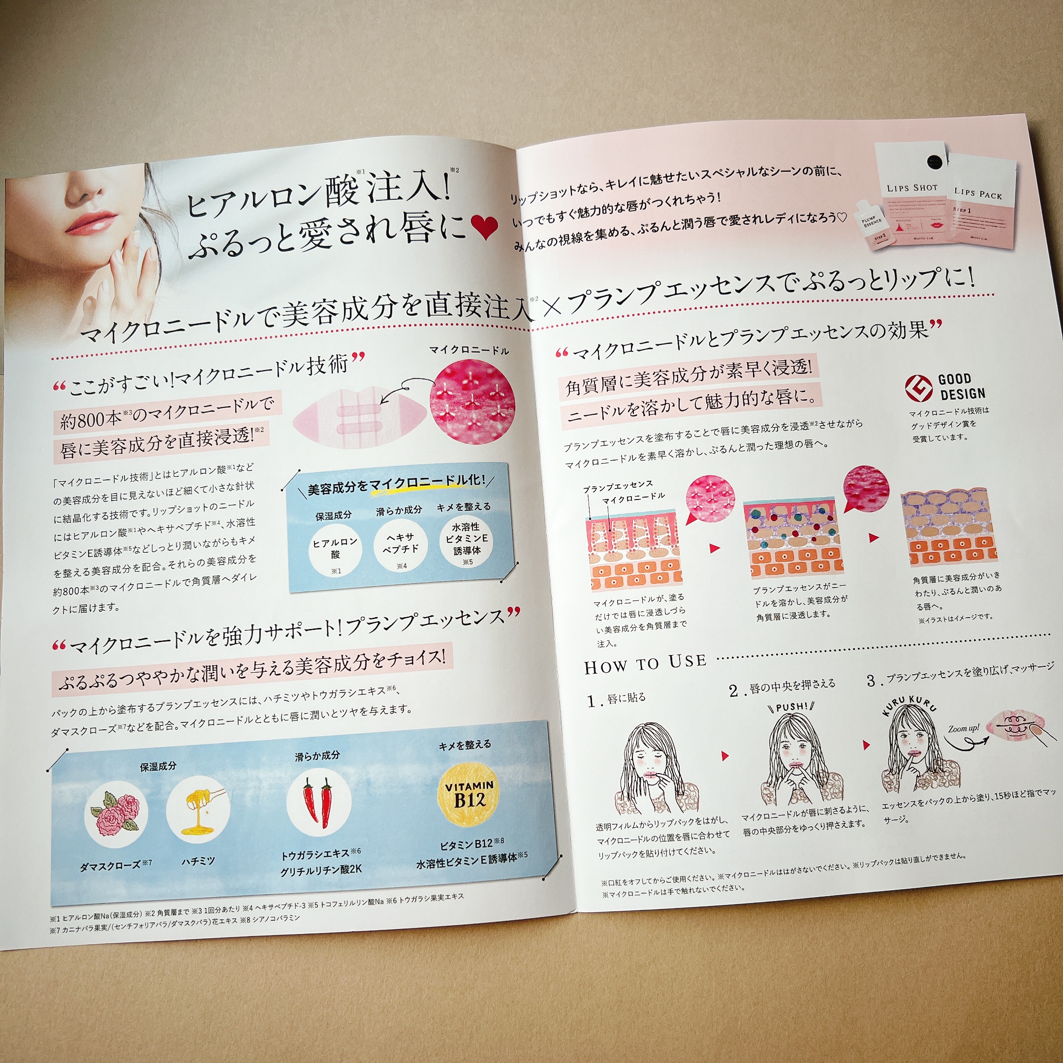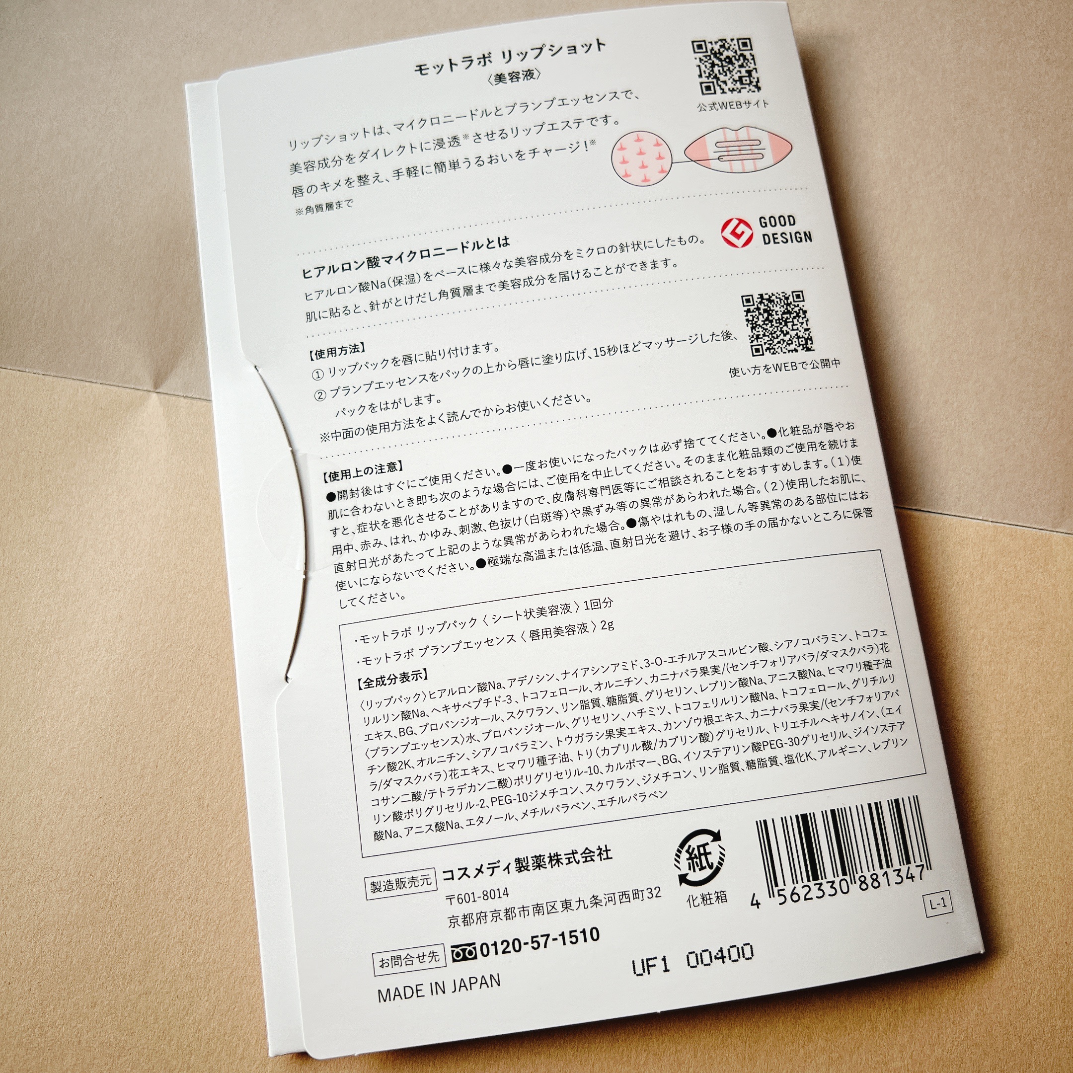 - LIPS SHOTは唇を自然にふっくらさせる唇専用パックです。唇をふっくらさせるヒアルロン酸Naなどのプランプ成分を、針状に結晶化した独自開発のマイクロニードルで、塗るだけでは届かないプランプ成分を唇の角質層までダイレクトに届けることができます。 [セット内容] ・モットラボ リップパック(シート状美容液/1回分) ・モットラボ プランプエッセンス(唇用美容液/2g)