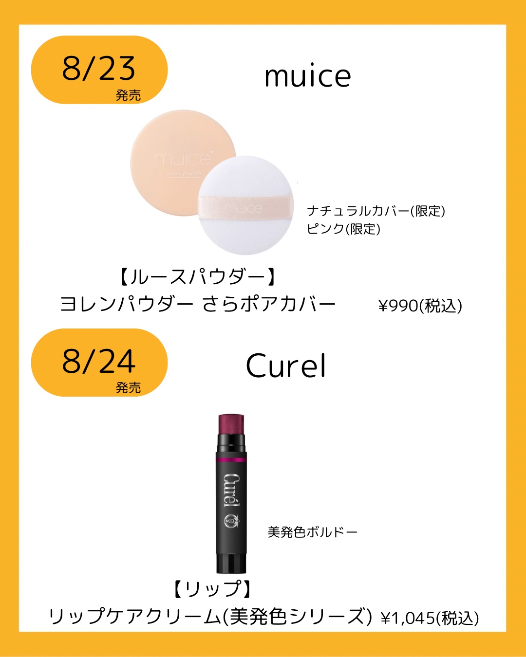 8月9日(金)発売 → #CipiCipi(#シピシピ)・グリッターイルミネーションライナー S(全7色うち限定1色)各¥1,320 8月21日(水)発売 → #CLEARTURN(#クリアターン)「#毛穴小町」シリーズ・まいにち毛穴小町マスク30枚入 ¥1,980 9月24日(火)発売 → #BLENDBERRY(#ブレンドベリー)・オールユーニード クリエイション(全5種うち限定1種)各¥1,650