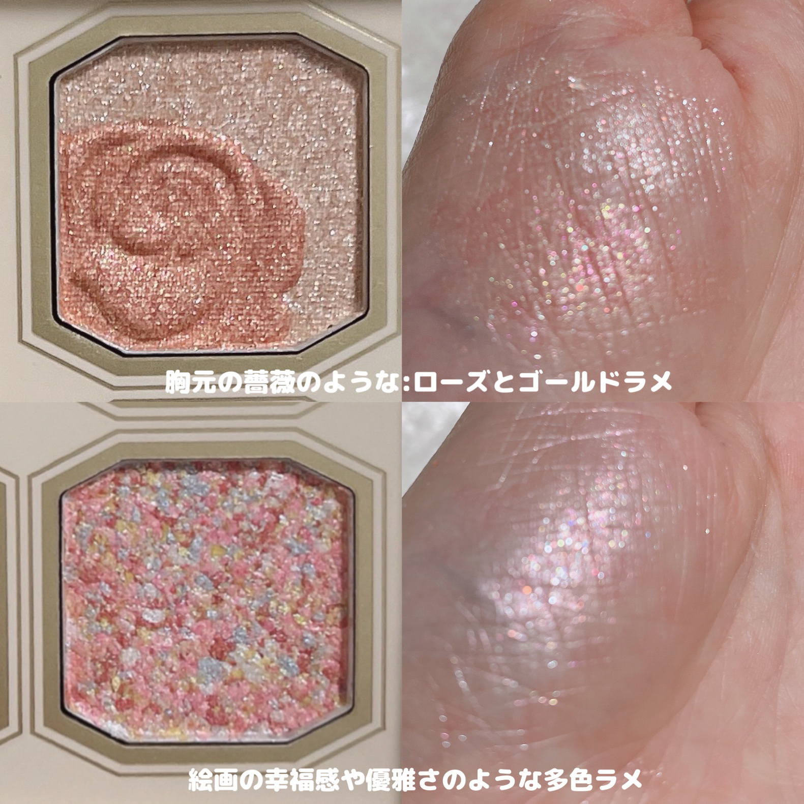 一見華やかなピンクに見えるんだけど実はふんわり使いやすいピンク。ピンクメイクに挑戦してみたい方にもオススメの使いやすいパレットなんです💓💫 華やかなラメと繊細なパールで全体的にキラキラとしたパレット。ベースに使いやすい白っぽいマットカラーも1色入ってます。 粉質は結構柔らかめでふんわり付きます。色を重ねた時にパキッと分かれにくくてグラデーションやぼかしもしやすい!