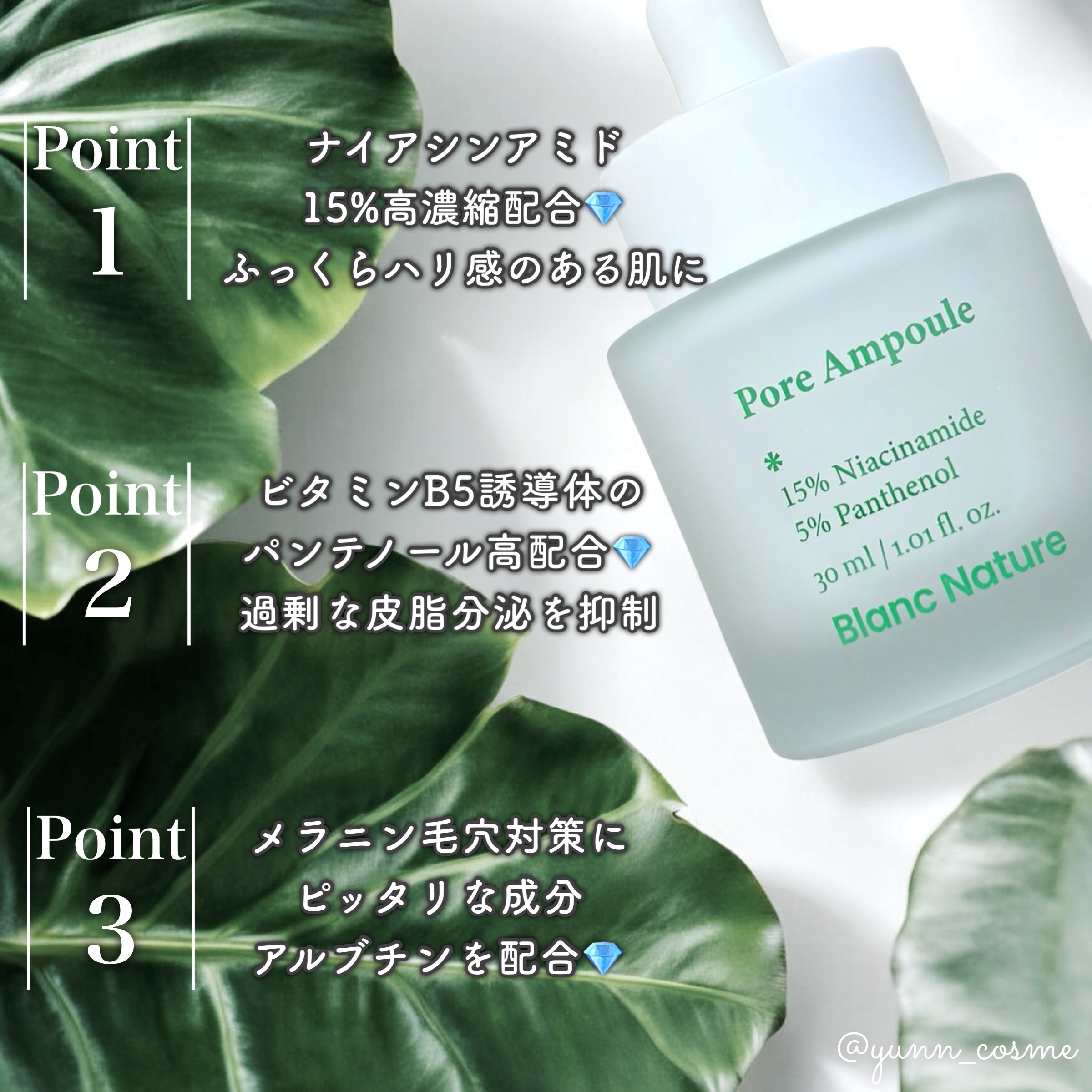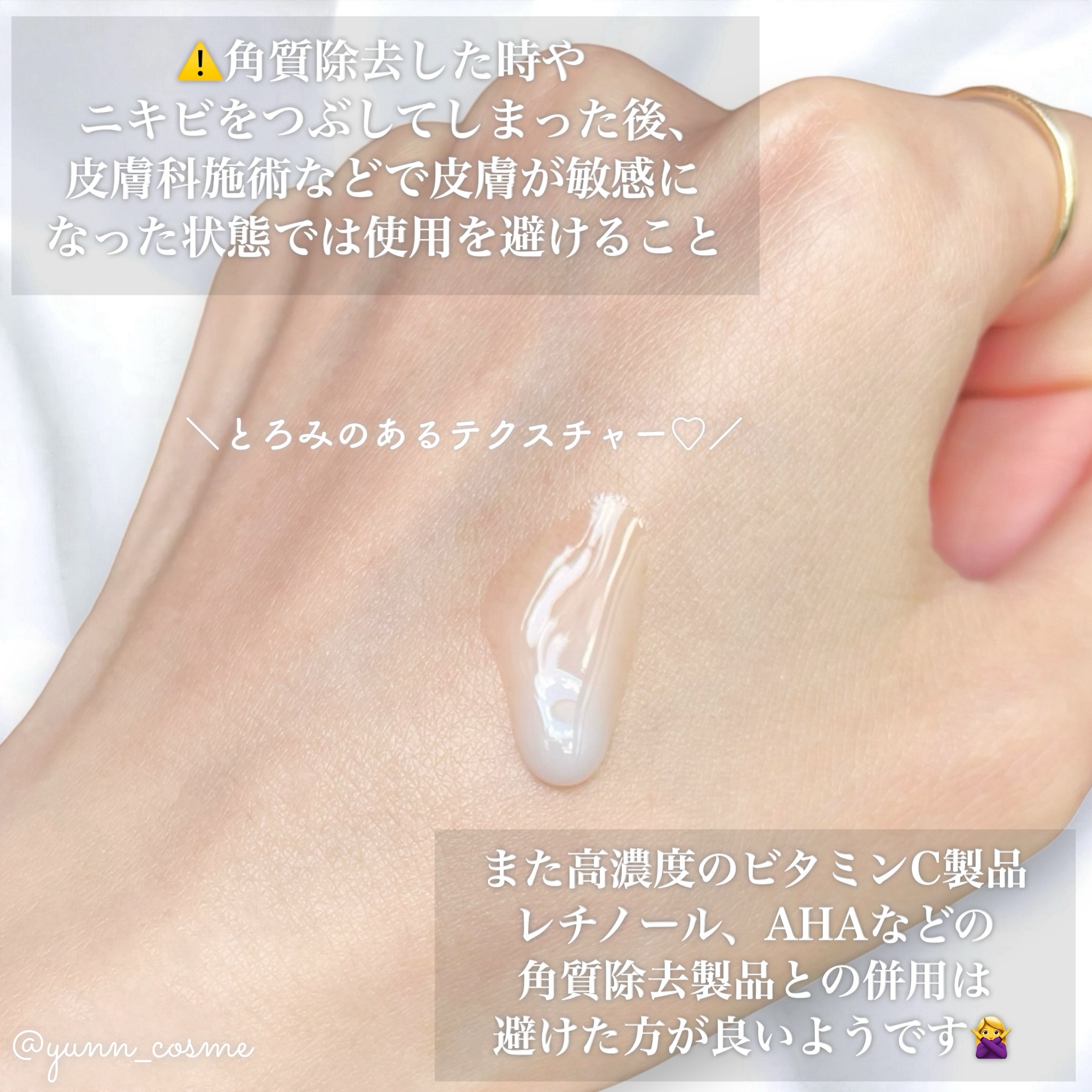 ポテッととろみと厚みのあるテクスチャーでみずみずしさもある使用感がお気に入り!! しっとり感があるのに、ベタつきが気にならないので色んな方が使いやすそうです✨ それぞれに効果が期待できるナイアシンアミド15%、パンテノール、アルブチンを配合しているそう🌿