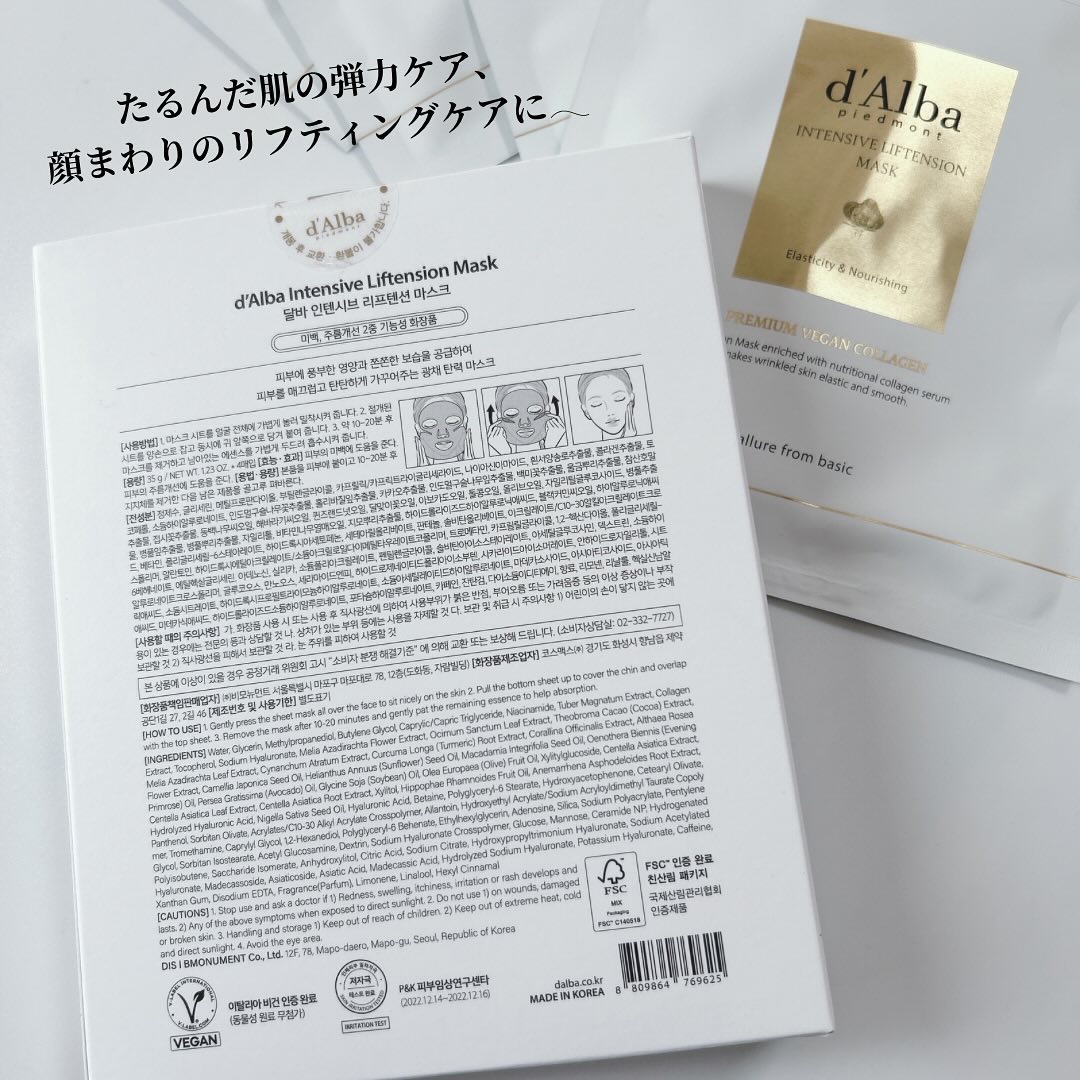 今年多分一番売れてたイメージのd’Alba マスクがあるのも気になってたけどやっと試すチャンス到来! リフテンションは、リフト+テンション マスクに切れ目があって、それをこめかみのあたりまで引っ張りあげるとたるみを引き上げる感じでした イタリア産ホワイトトリュフ(ツベルマグナツムエキス(保湿成分))は同じく配合されてます