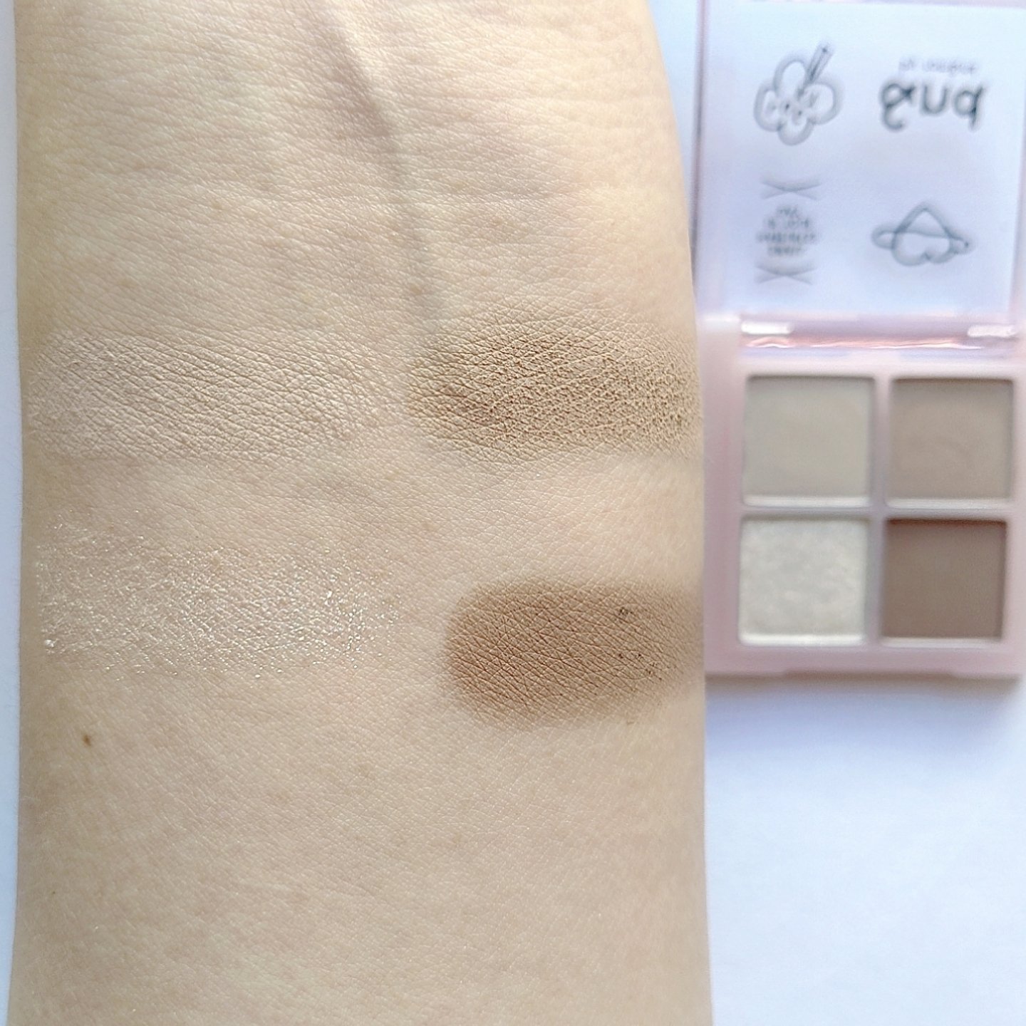 プチプラのクオリティじゃないっ!! 発売前からチェックしていたけれど、ここまで可愛いとは…😆 絶妙カラーで目もとのくすみを飛ばして*明るい印象に🩷 横割りグラデーションでメイクし、立体感をより出したかったので最後に1番左のカラーを上まぶたの真ん中と涙袋にのせています🙆 肌馴染みも良くて粉飛びも感じにくかったです💕 ブラウンの方も店頭に出てたら買おうかな💓