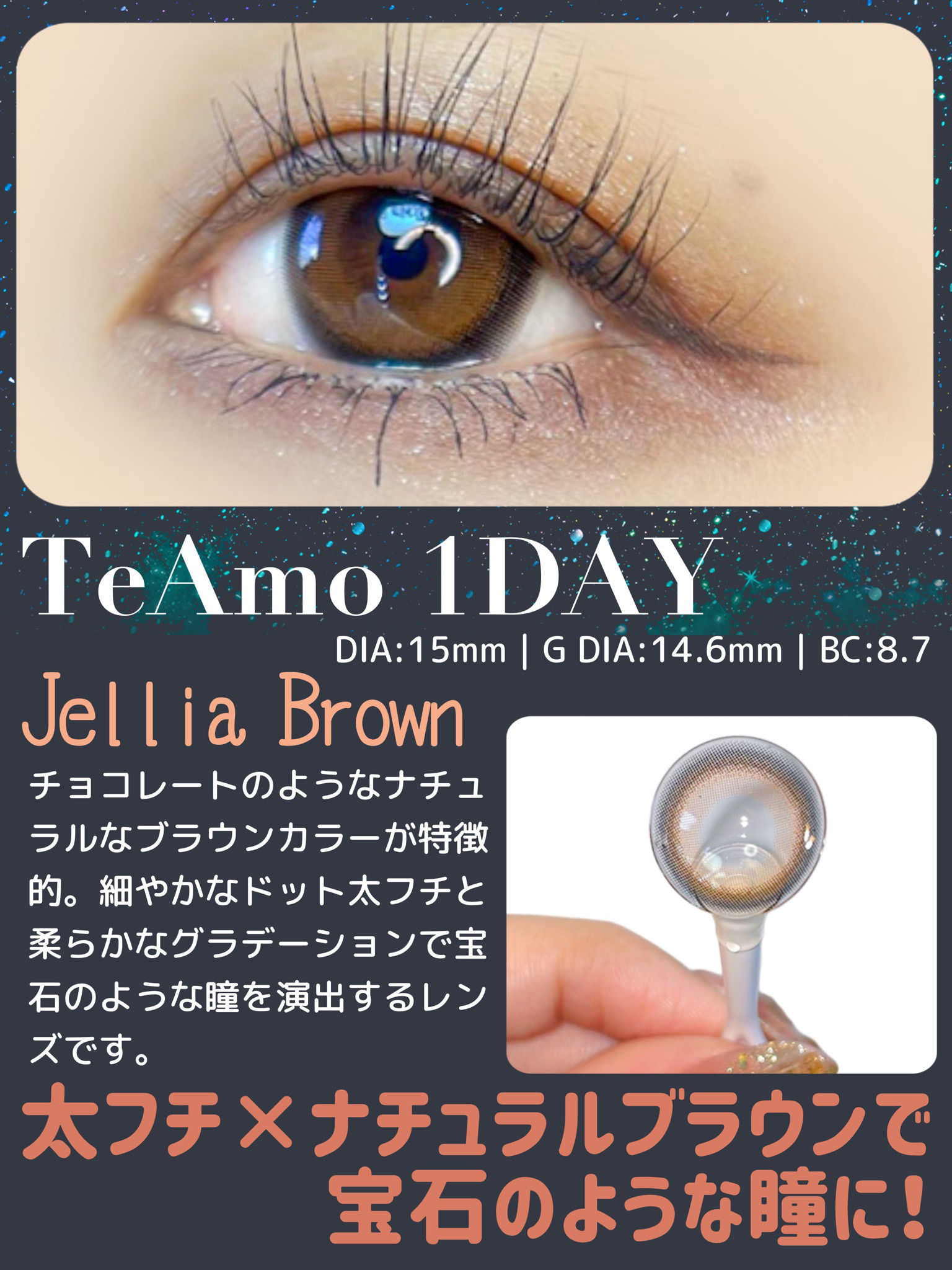 \着色直径大きめカラコンに挑戦してみた😽❤️/.⋆𝜗𝜚⋯𝜗𝜚⋯𝜗𝜚.⋆TeAmo1DAYジェリアブラウンJelliaBrown¥1,320メガ割で3箱セットで購入しました📦(3000円前後)着色直径14,6mmベースカーブ8,7含水率55%サ...