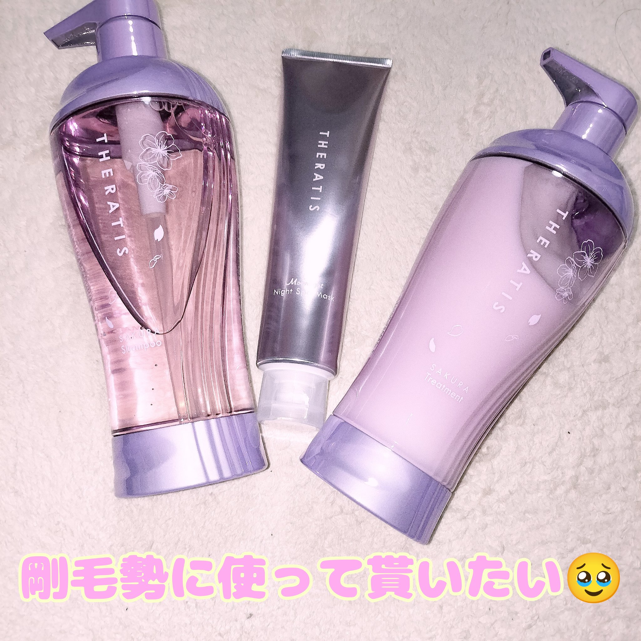 うねりクセに特化したTHERATIS! 今回はTHERATISセラティス サクラ ムーンライト スリーク トリプルセットのナイトスパマスクのレビューです。 ナイトスパマスクをした後に流さず、そのままトリートメントをつけることができます。 これが他社とは違うところだと思います。 香りはシャンプートリートメントと同じ香りで、とてもいいです。 昨年の限定品なので大事に使っています笑
